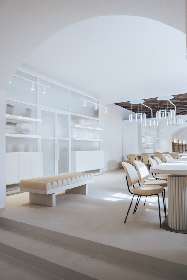 Through the floor-to-ceiling windows, light falls inside and the view outside – the floor made of Adnet marble seamlessly transitions from the inner courtyard to the café. A feast for the eyes …