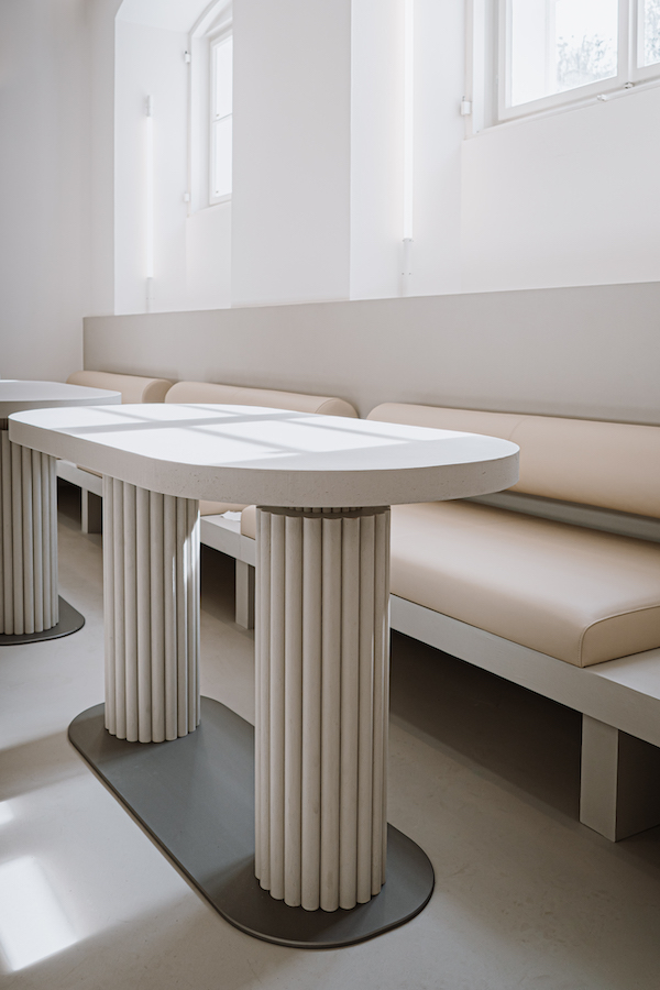The twelve-meter-long concrete bar is the centerpiece of the café. It serves as a communication and exhibition space at the same time