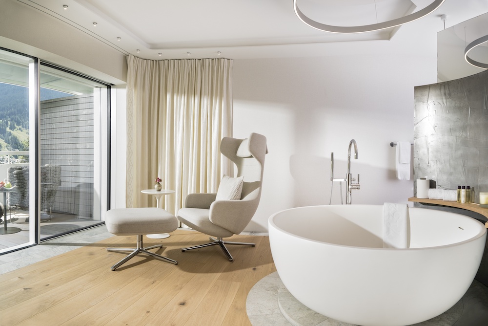 The luxurious 7132 Hotel is the figurehead of the ensemble. After a complete renovation of the old spa building it was opened in its current shape in 2017.  It is marked by clear, contemporary design in which light colors and noble, natural materials dominate. Every room has a breathtaking view of the surrounding mountains. The top floor of the five star hotel awaits guests with three 90 square meter penthouse suites that were designed by Japanese star architect Kengo Kuma.