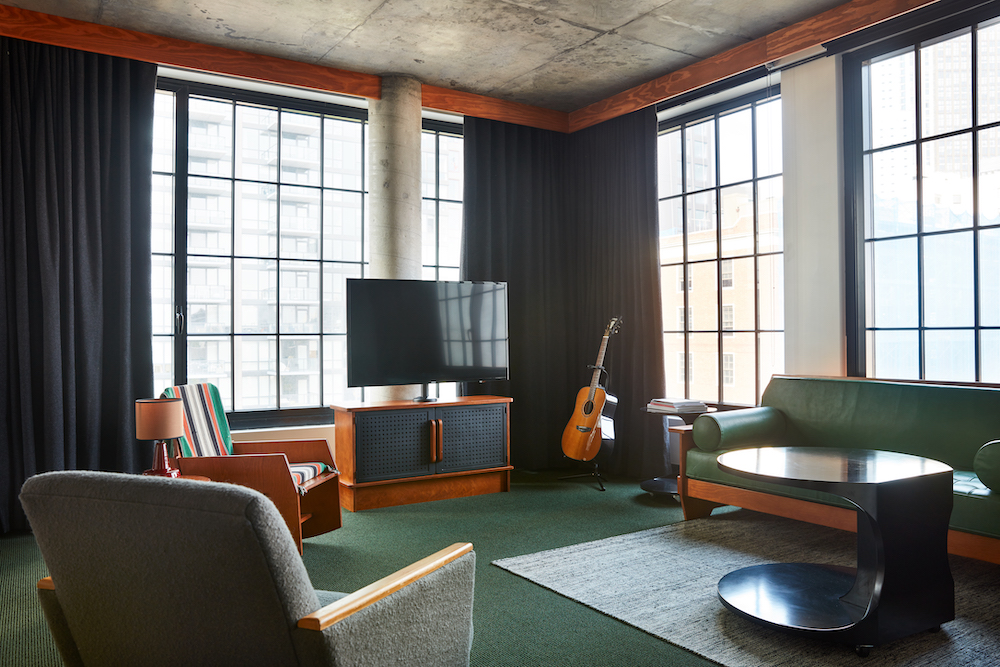 On the outside, a Brutalist facade marks the hotel’s appearance. Like the interior, it was also designed by New York’s studio Roman and Williams. The rough, edgy facade of metal, glass and concrete pieces is lightened up by a customized ceramic mural by the famous Modernist Stan Bitters as well as light installations by Roman and Williams.