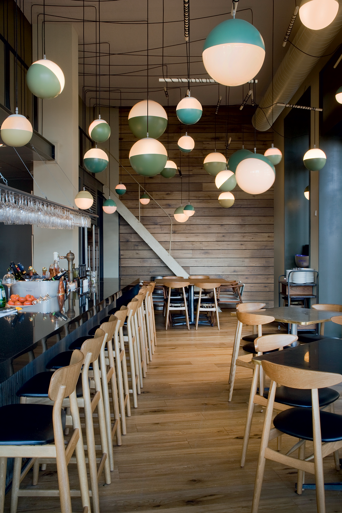 The building from the 30s has seen other times. When Tarruella Trenchs Studio started the renovations for the Bistro Al Tun Tun, they were faced with an oli-spilled garage. The designers were inspired by classic 19th century French bistros and spiked that up with contemporary design. The open kitchen is the central stage of the dining area. This provides the chefs with daylight and lets the kitchen communicate with the outside world.