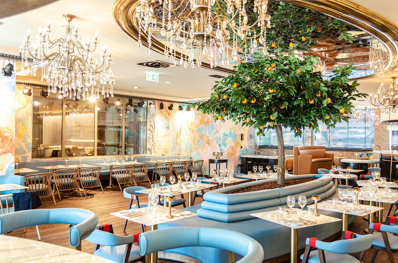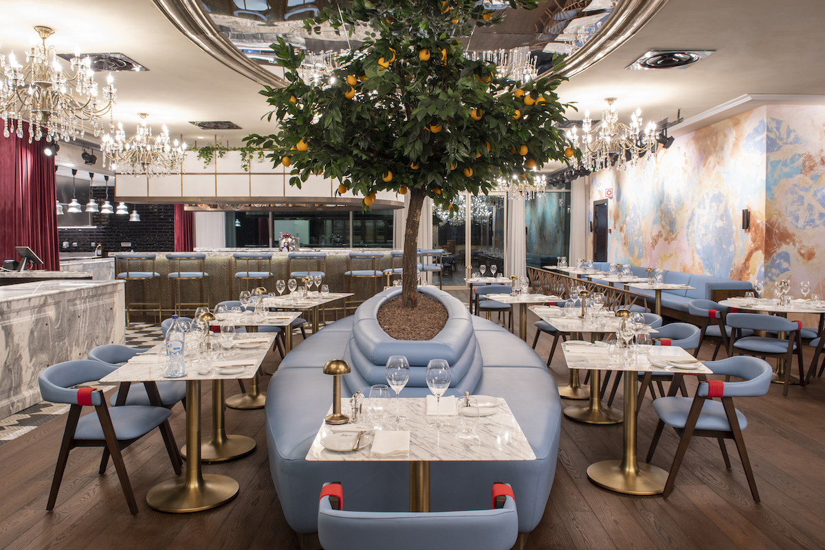 Magnificent chandeliers, counters made of Arabescato Carrara marble and murals create an Italian feeling.