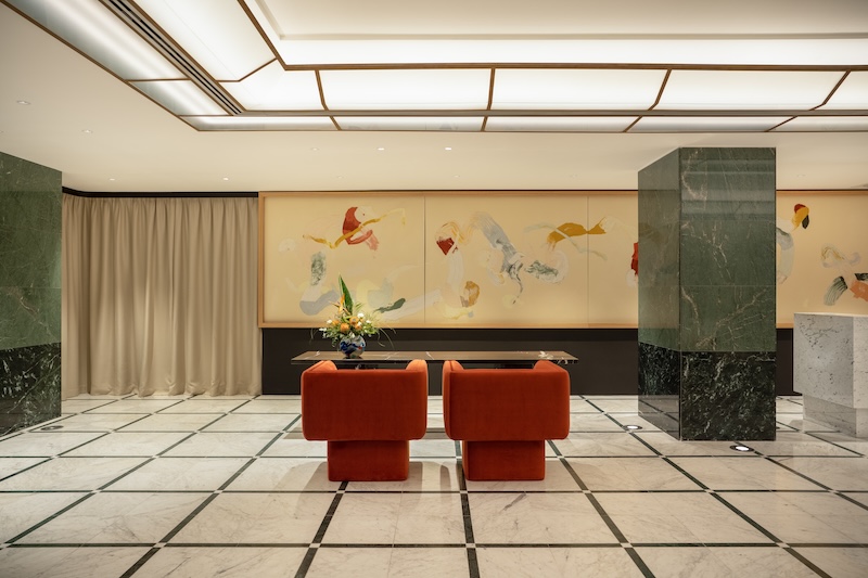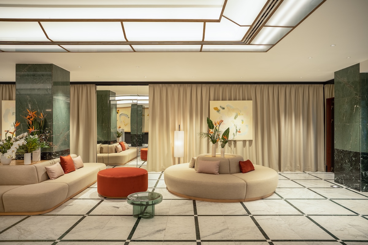 Designed by Spanish studio Tres Cinco Uno, light-colored tables and dark green natural stone cladding complement the sculptural yet comfortable upholstered furniture.