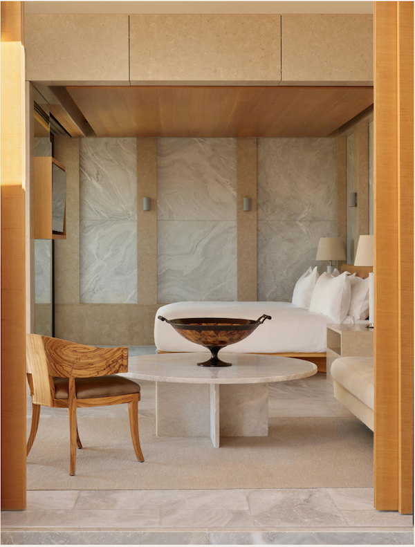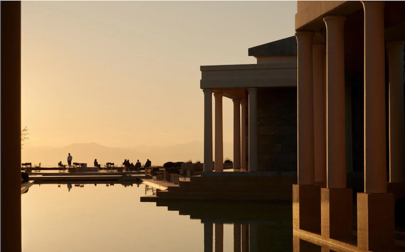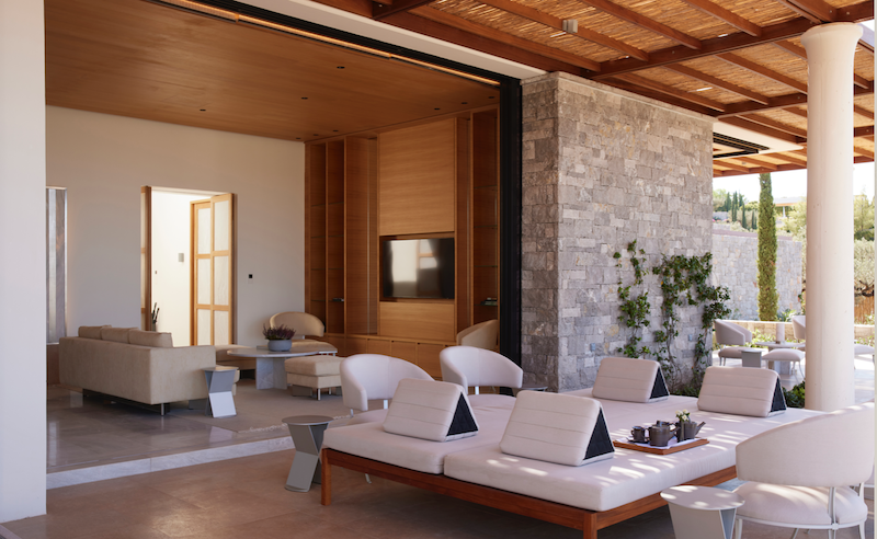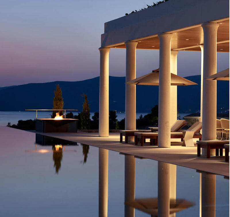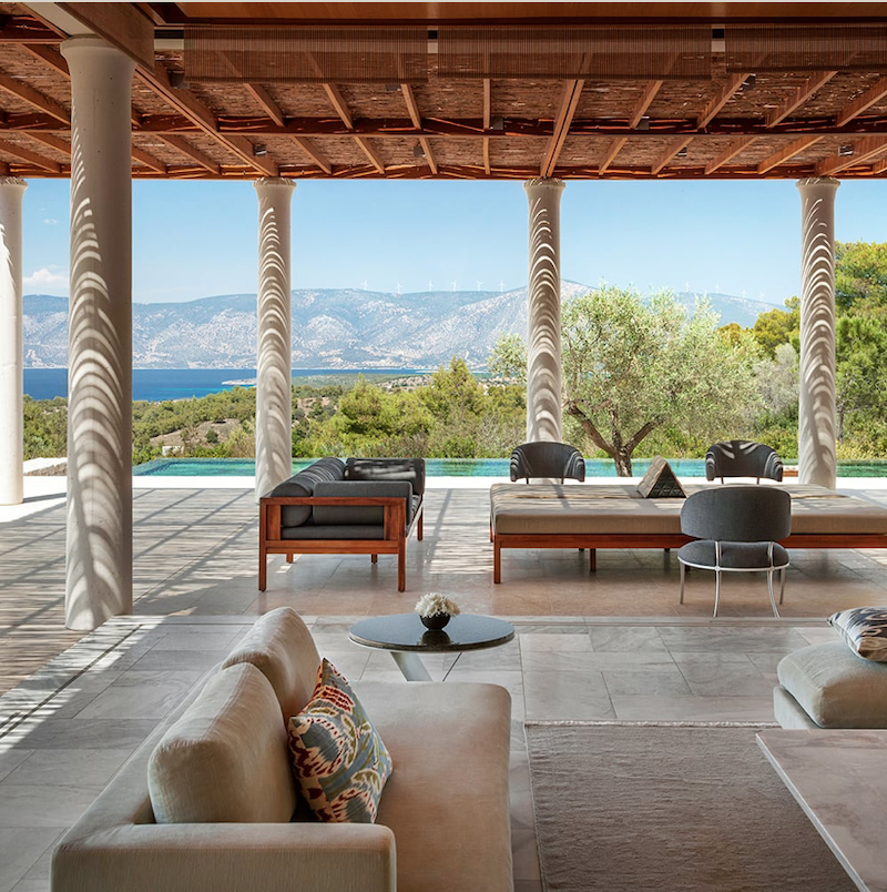 In a nod to classical Greek architecture, all 38 freestanding pavilions at Amanzoe Greece open onto terraces with private pools and views of the surrounding land and sea – speedboats wait on the beach to shuttle guests between nearby islands.