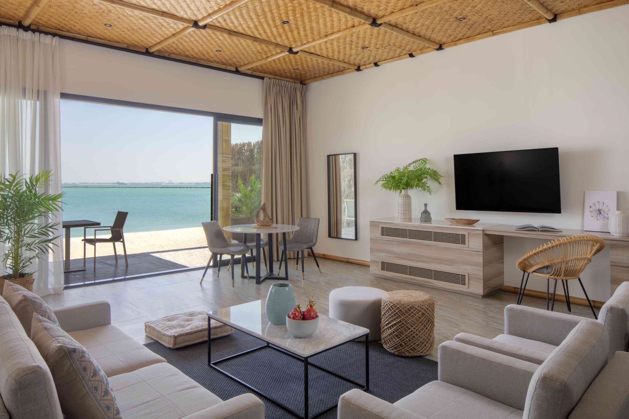 The Ocean View Rooms are a bit more urban, at least visually. The up to 93 square meter large rooms allow a view of Dubai’s skyline from their balconies. Nature fans have the beach directly in front of them in the Beach Pool Rooms. The monochrome color scheme with many natural shades and wood fits the concept perfectly.
