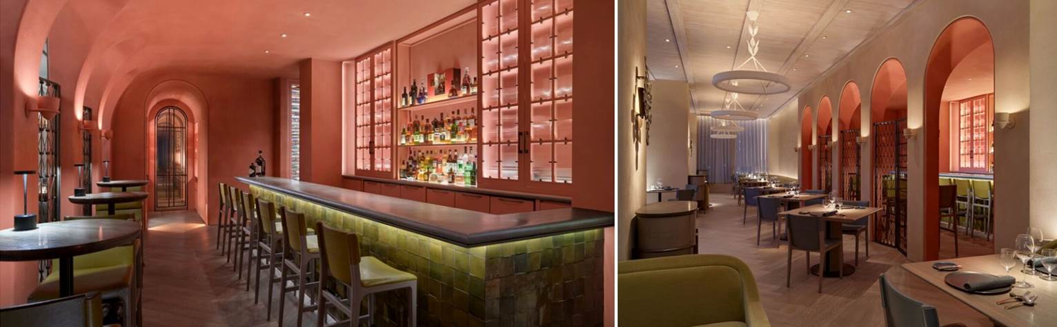 The restaurant is split into a dining and bar area. The color schemes range from subtle red to natural hues to fresh green. Arched ceilings, rounded arcs and gigantic chandeliers add a sense of drama.