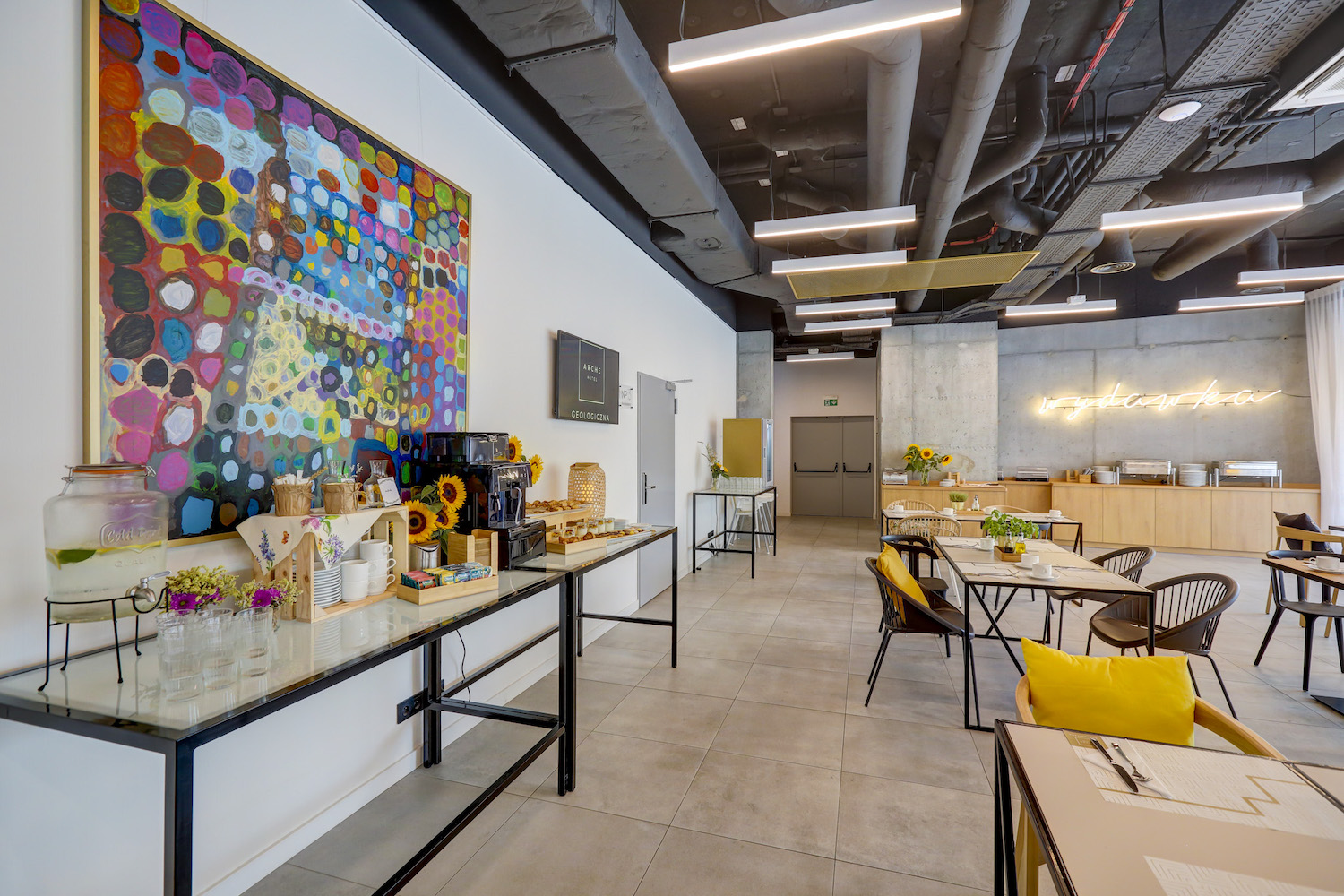 Industrial style meets Art-déco elements and creates a casual look. To loosen the cold feeling of concrete and the dominant grey and introduce more warmth, yellow and blue contrasts were introduced.