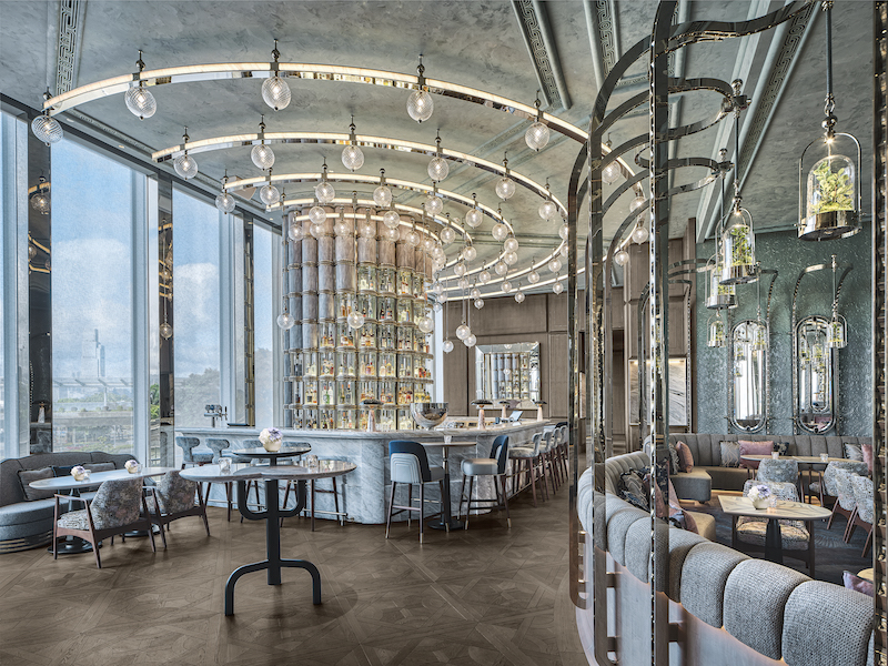 Guests are greeted at the entrance by a floral, bespoke wooden inlaid wall leading to the conservatory. Elegant, curved metal frames are accented with small, hanging terrarium pendants and complemented by custom-produced ceramic wallpaper, while a custom deconstructed chandelier with globes positioned in undulating semicircles draws the eye to the bar.