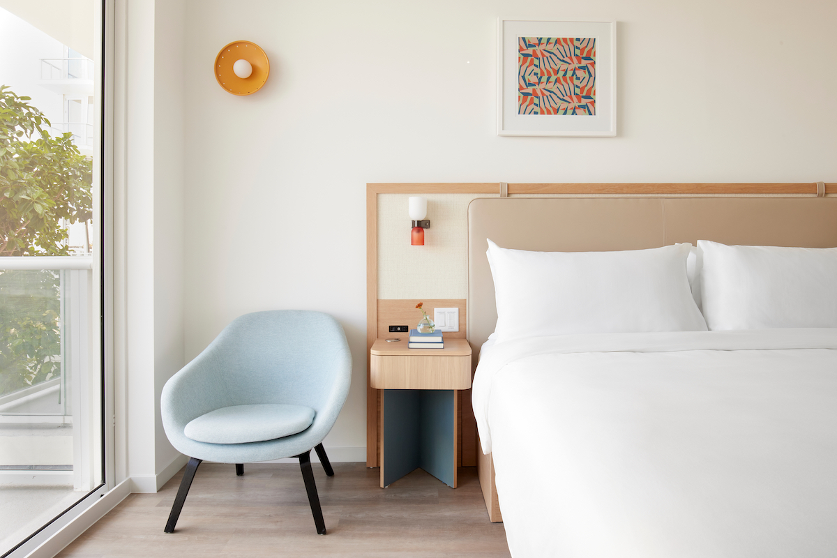 The exterior walls of the hotel feature works by artist Hoxxoh, who is known for his “spheres of life” that illustrate the movements of space and time. Inside, clever design, intelligent use of space and white oak furniture create a comfortable place to relax.