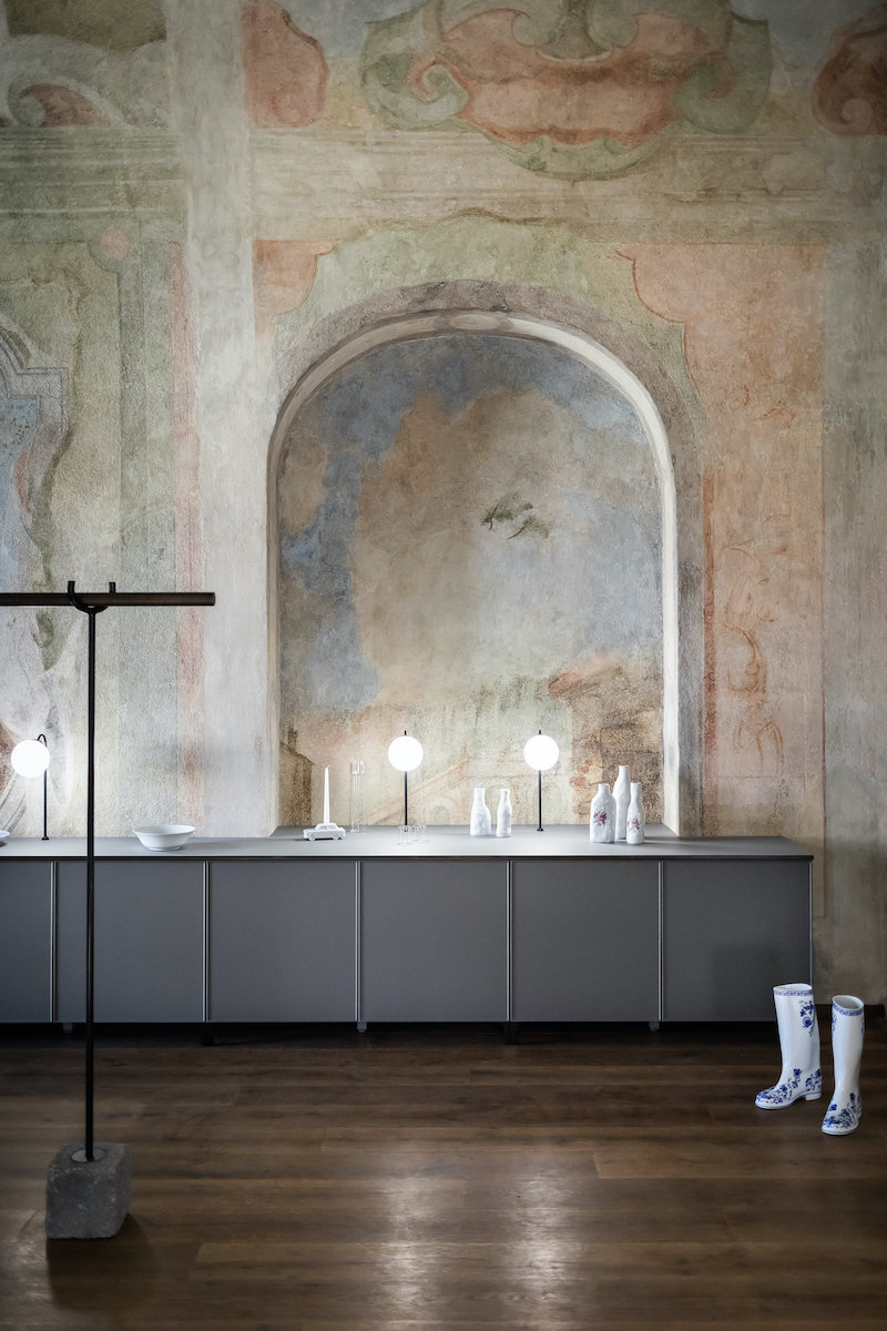 It is worth it to focus the attention onto the wonderful contrast between modern art objects and historic room concept, including decorative, old wall paintings