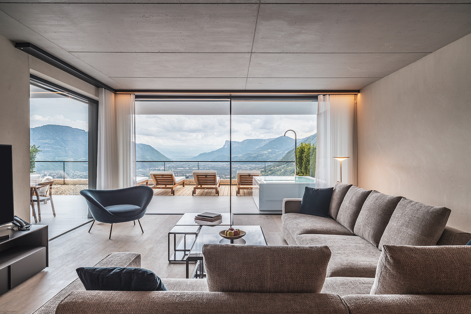 The idyllic Etsch valley below and the monumental Dolomites on the horizon – the panoramic view that guests enjoy is one of the most stunning in South Tyrol. But not only is the view worth a visit: embedded in vineyards, fruit orchards and olive groves, the villas, terraces and gardens of the Arua Private Spa Villas are the perfect place to relax and rest.