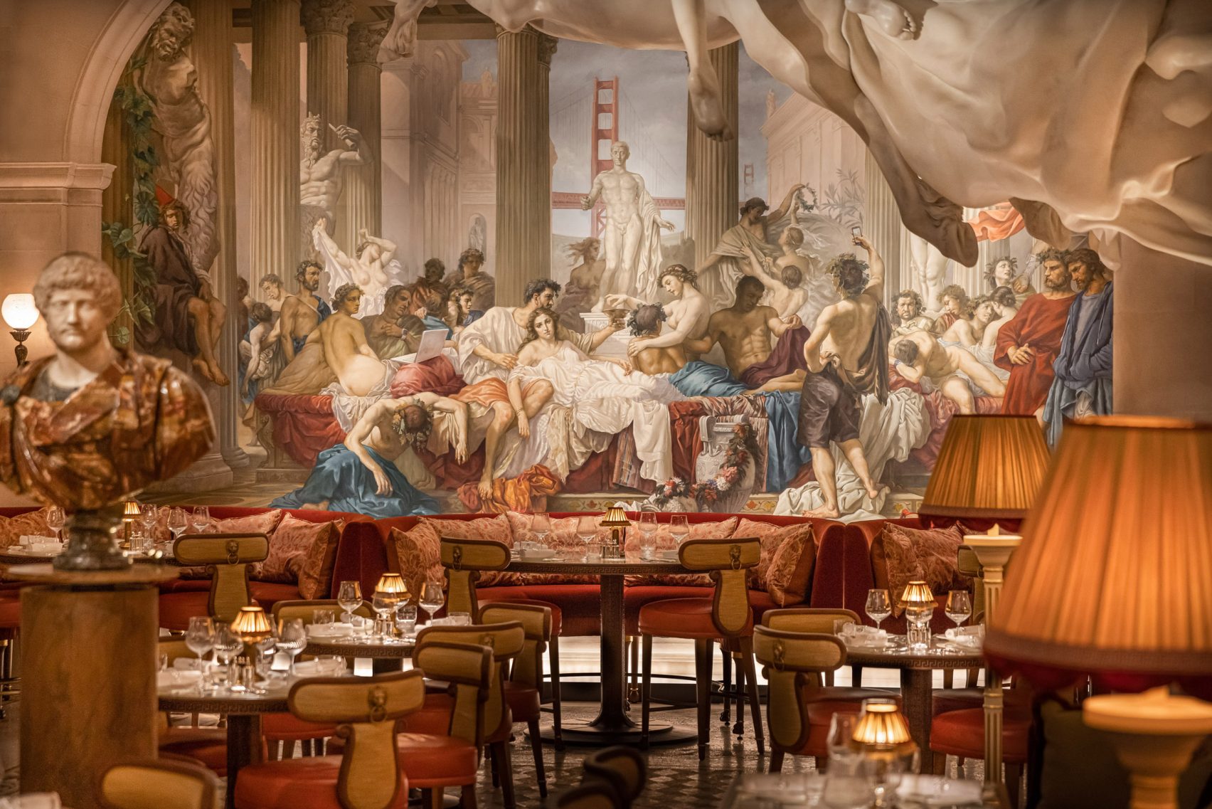 The main dining room features five monumental statues created by British artist Damien Hirst, depicting a winged lion, a unicorn ridden by a pair of winged lovers, another unicorn, Medusa and Bacchus.