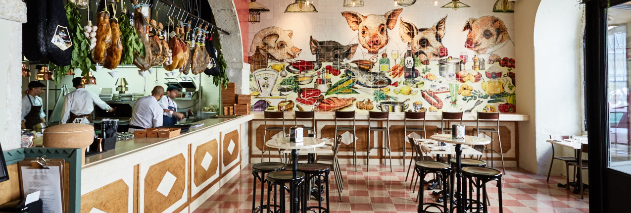 The different areas of the Bairro do Avillez are designed authentically: from the rustic wood shelves in the Mercearia to the blue tiled counter in the Páteo and the beautifully painted pigs on the walls of the Taberna.