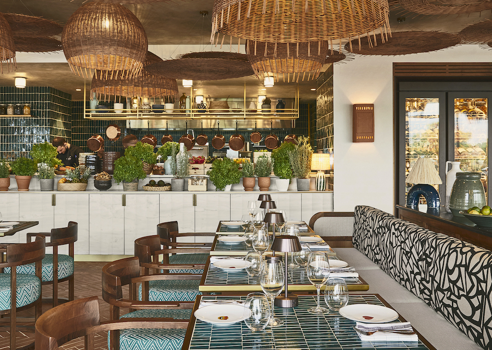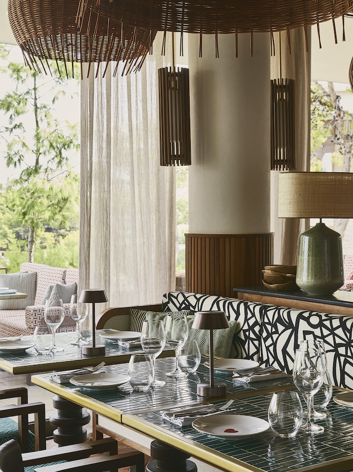 The table tops are made of ceramic tiles, woven baskets hang from the ceiling, hand made ceramic lamps decorate the walls. At the same time, massive materials dominate. The floors are terracotta, the furniture walnut and iroko.