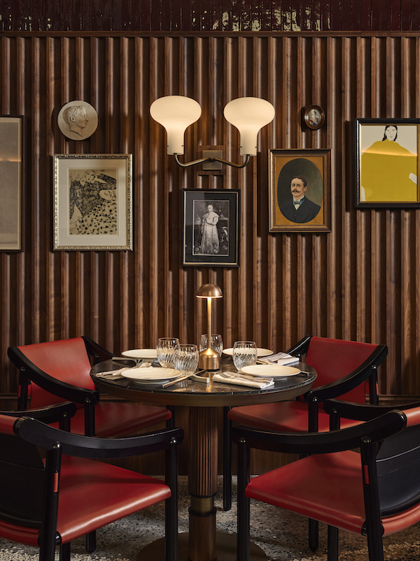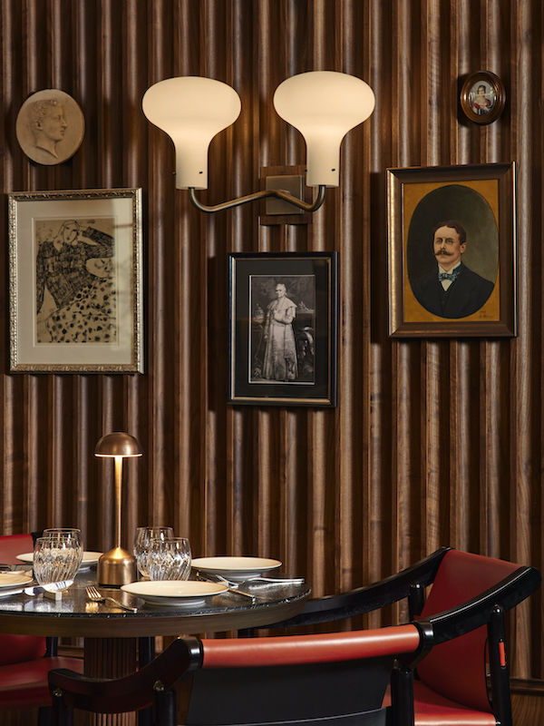 All areas are united by the terrazzo floor in shades of green, black, white and burgundy with a stylized wave pattern – a tribute to the architect Luigi Caccia Dominioni. The half-height wood paneling is theatrically decorated, triptych chandeliers by designer Ignazio Gardella and an eclectic collection of artworks in various styles adorn the room.