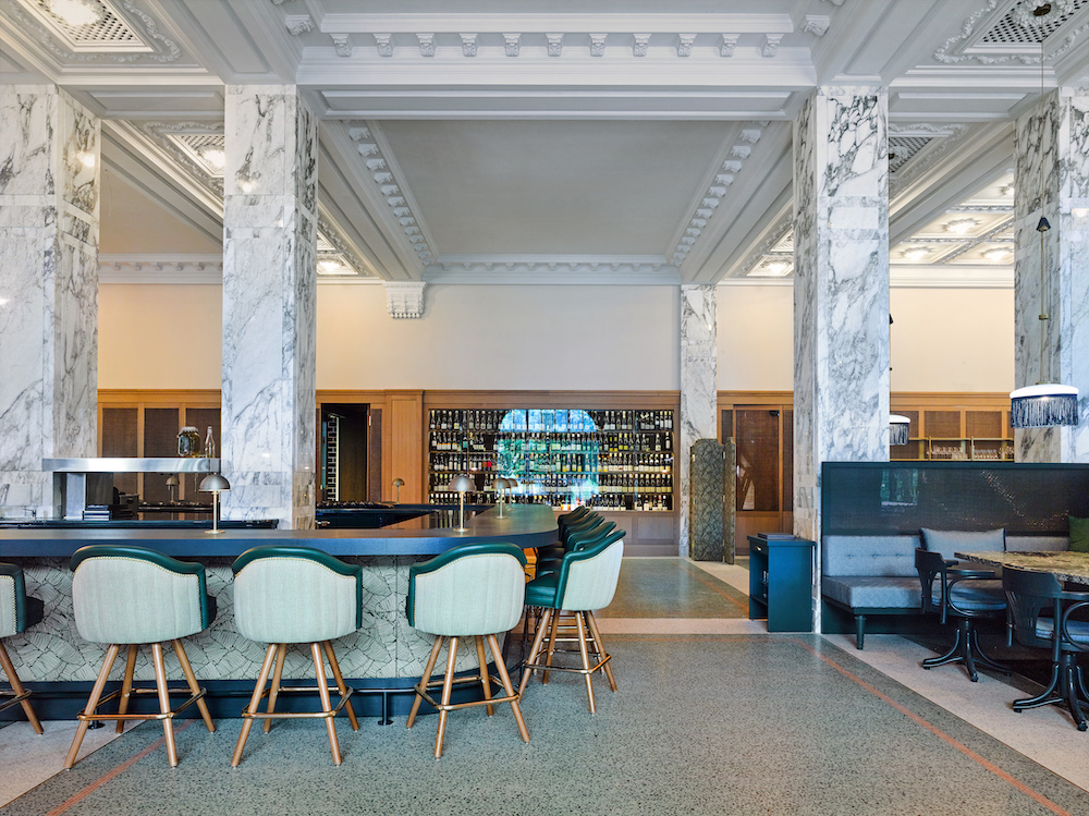 The long and wide counter of the bar is a specialty. The cooks can be watched from there. Claudio Campanile from Campanile + Michetti Architekten is chef architect of the new Kultur-Casinos Bern. The Atelier Zürich is responsible for the interior.