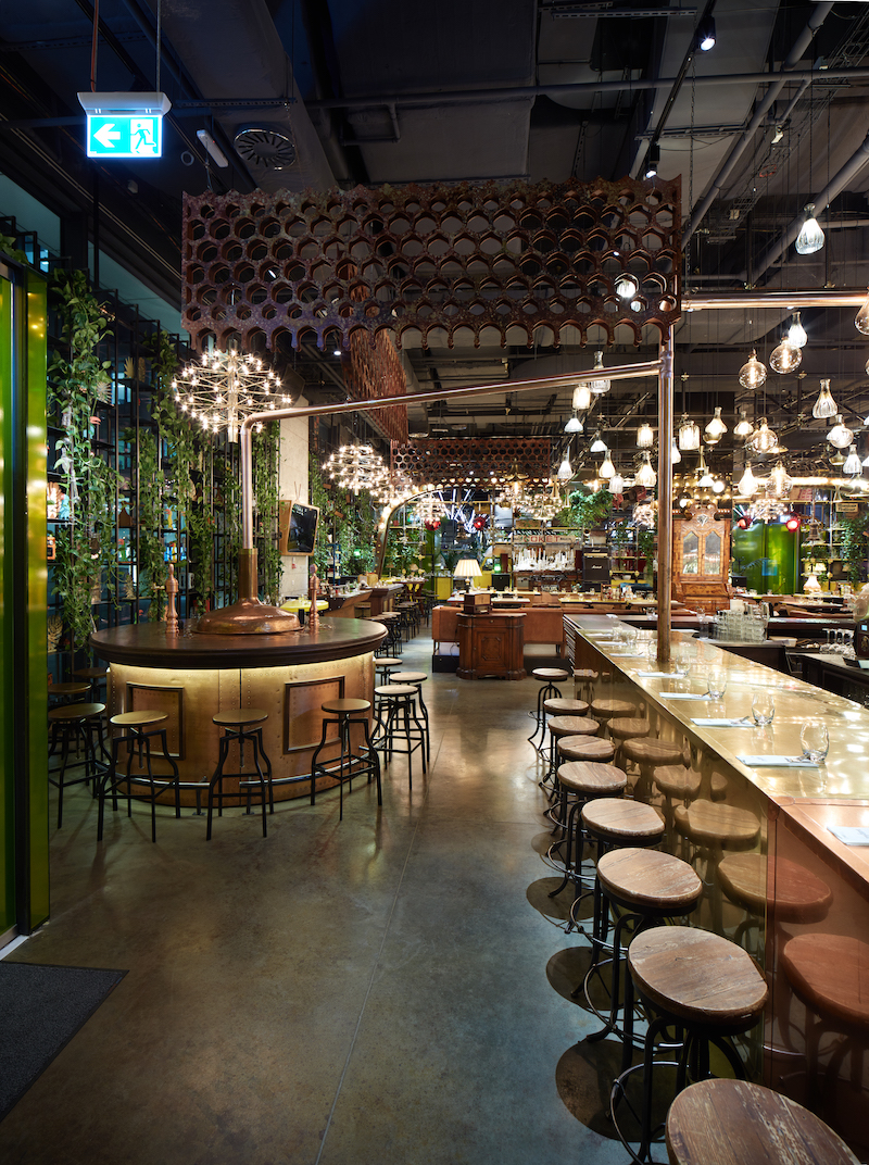 The eclectic furniture mix highlights 1961 chairs of the Dutch modernist Friso Kramer. The contrasting effect of these manifold details represent the soul of the room. That can also be felt when the food is served on iron boards and cordial in crystal glasses.
