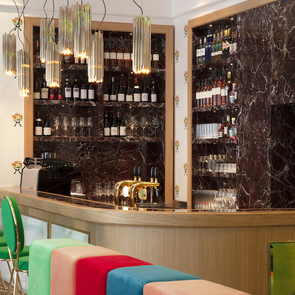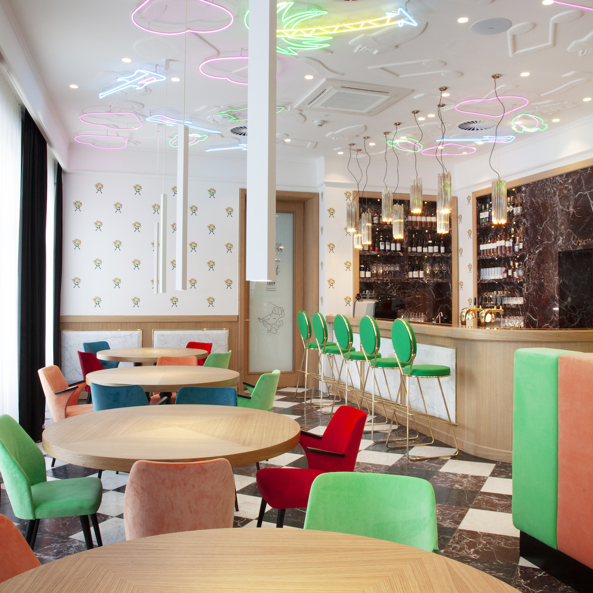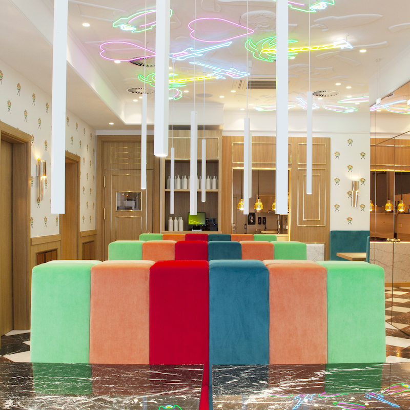 Delicate wallpaper flowers meet glittering golden details, velvet-covered seating in bright colors contrasts with black marble and neon light rockets on the ceiling.
