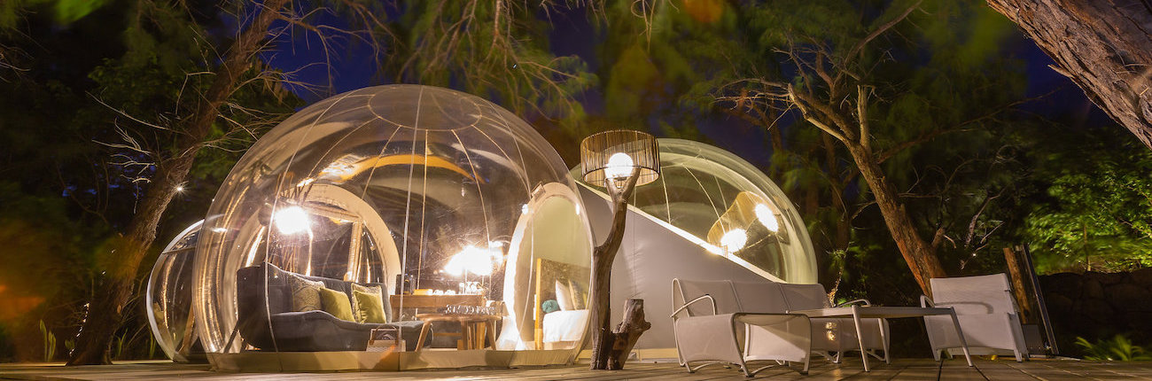 Tent, air mattress and gas cooker are a thing of the past! Guests of the paradise-like island Île aux Cerfs located off the East coast of Mauritius can experience a luxurious and cozy stay close to nature: Transparent bubbles with comfortable features await guests that can basically sleep under the sky in the middle of the tropical landscape.