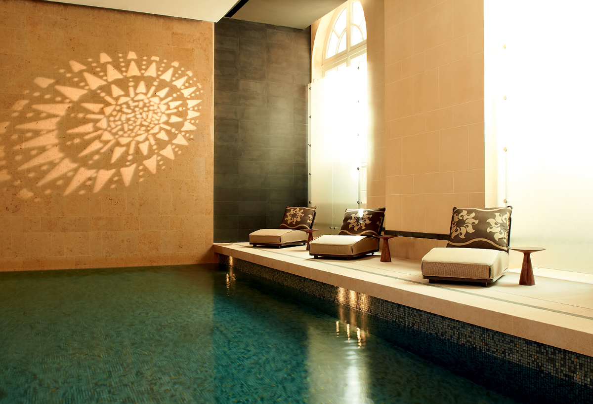 Der superexklusive VIP-Zweierbehandlungsraum bietet sogar Privat-Jacuzzi und einen eigenen Pool. Clarins-Beauty-Behandlungen sind außerdem ein zentraler Teil des Angebots. Architekt Anthony Béchu ließ sich beim Design von der Welt des Mittelmeers inspirieren.