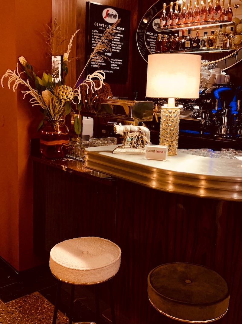 Ten years after closing, the legendary Café Roma celebrated its comeback in 2019, The new Address is only a few steps away from the former one. Architect duo Daniel Hildmann and Daniela Wilke worked with an interesting material mix for the new Roma: Spectacular wallpapers, red plush sofas, lots of velvet in rich shades and a tin bar counter.