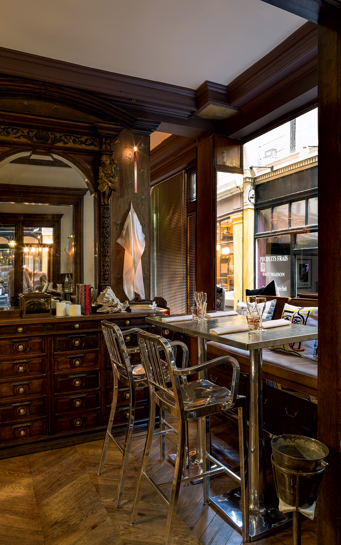 Caffè Stern in the picturesque Passage des Panoramas in the 2nd Arrondissement evokes associations of a Tim Burton film scenery: a magic, surreal world. You are greated by a stuffed wolf and linx with glittery deco. Winged white rabbits sit on the fire place and seemingly thrown white sheets act as lamp shades. Young Parisian entrepreneur David Lanher and the Alajmo brothers (one of them is Italian Michelin-starred chef Massimiliano Alajmo) assigned architect Domique Averland and designer Philippe Starck to restore and design the historic, landmarked rooms.
