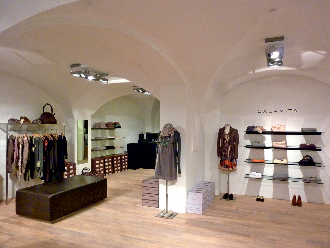 A place to go for women. Calamita, located downtown close to Mozart’s birthplace, offers ladie’s fashion from smaller French and Italian labels.The interior in the typical historic vaults is kept minimal in order not to distract from the fashion. White walls, dark wooden fllors and a few shelves are all that is needed.