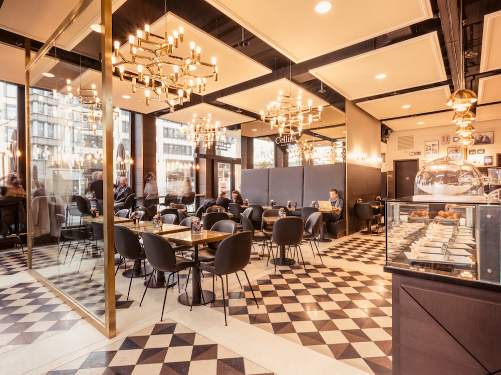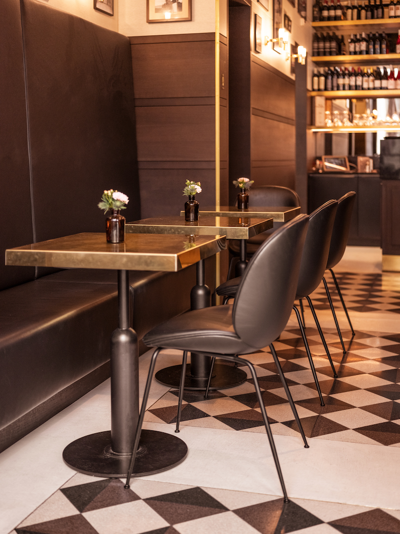 So it was easy to interpret typical elements in a modern manner for the Cellini. The main materials are granite, brass as well as wood. These all are embedded in a strict geometry that picks up the building’s structure and mirrors it decoratively on the floor, ceiling and wood paneling.