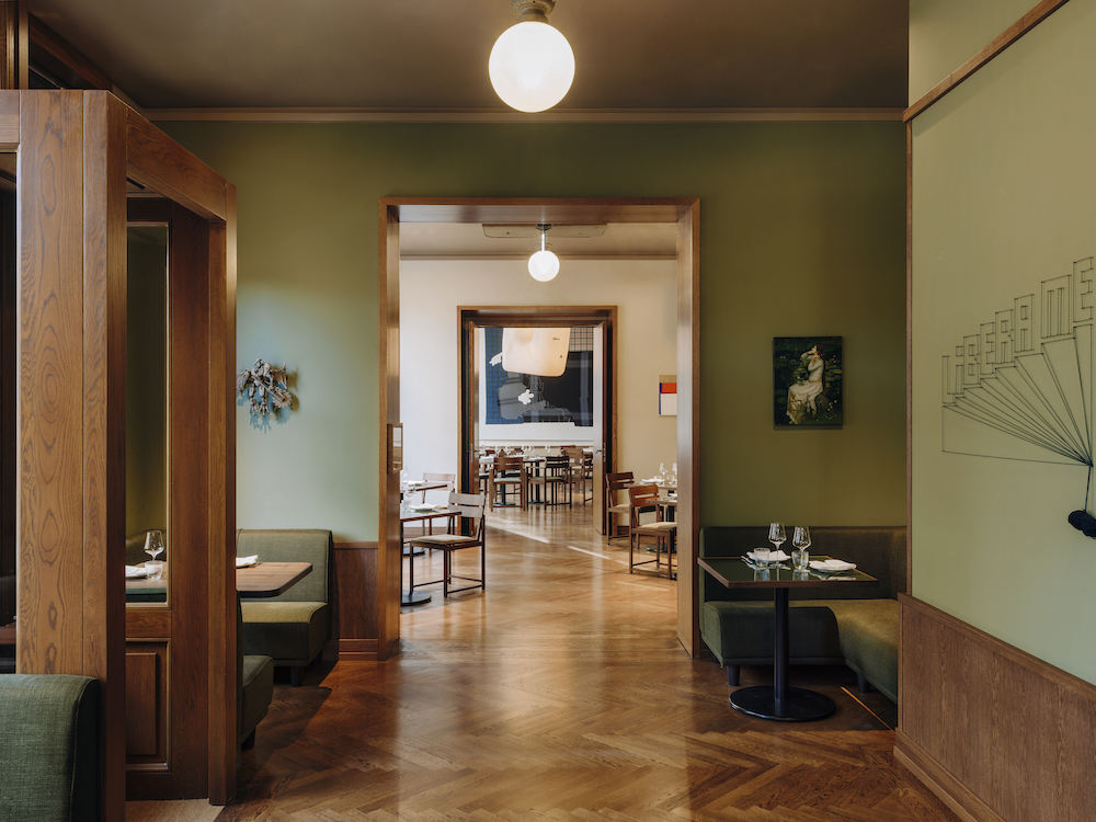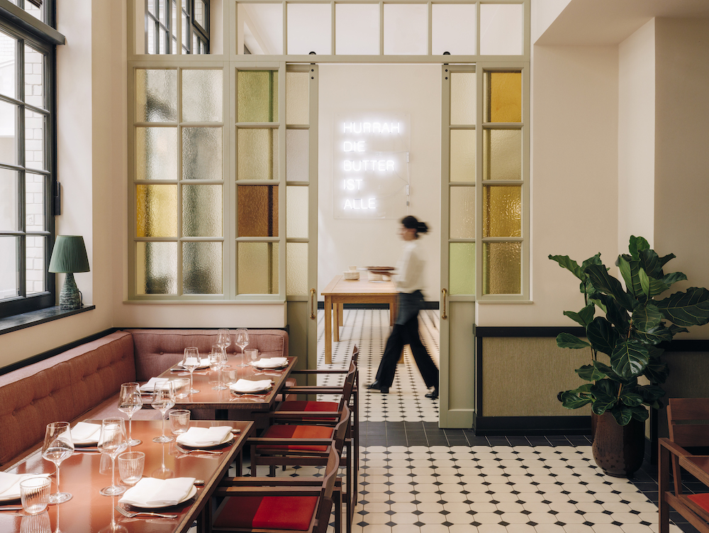 “With the appointments of the Château Royal we refer to the Berlin’s Wilhelminian time, but also the 1920s and with that two of the most memorable epochs for the city”, says Irina Kromayer, responsible for the design. Colored marble, chevron wood floors, oak, nickel and hand made Craquelé tiles mark the interior as does a colorful diced glass wall or sisal rug covered floors of asphalt referred to as ‘Berlin terrazzo’.
