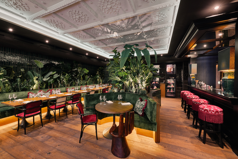 The dining lounge is adorned with traditional wall and ceiling bracing, and those who like a little more privacy can book the Japanese separee in red, where floor-length velvet curtains multiply in the ceiling mirroring.
