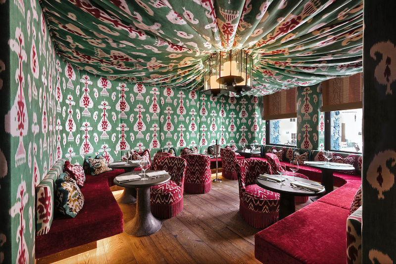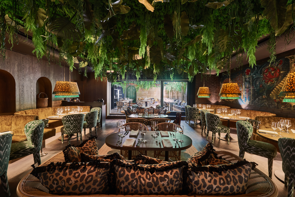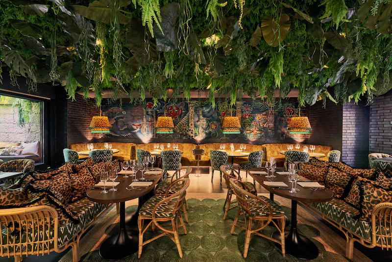 The ceiling is so lush with greenery, it’s as if you’re sitting in a jungle; underneath, furniture made of natural materials, colorful ikat and wild leopard prints get along surprisingly well.