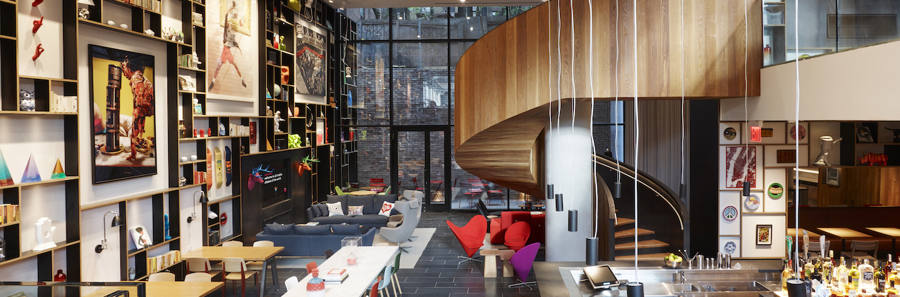 Ten years after its founding in 2008, the Citizen M hotel chain opened its second hotel in New York City. The newest location is in the highest building of the neighborhood but is also impressive in the inside. Amsterdam’s architectural studio Concrete leads guests over a striking spiral staircase to the communal living room in the ground floor.