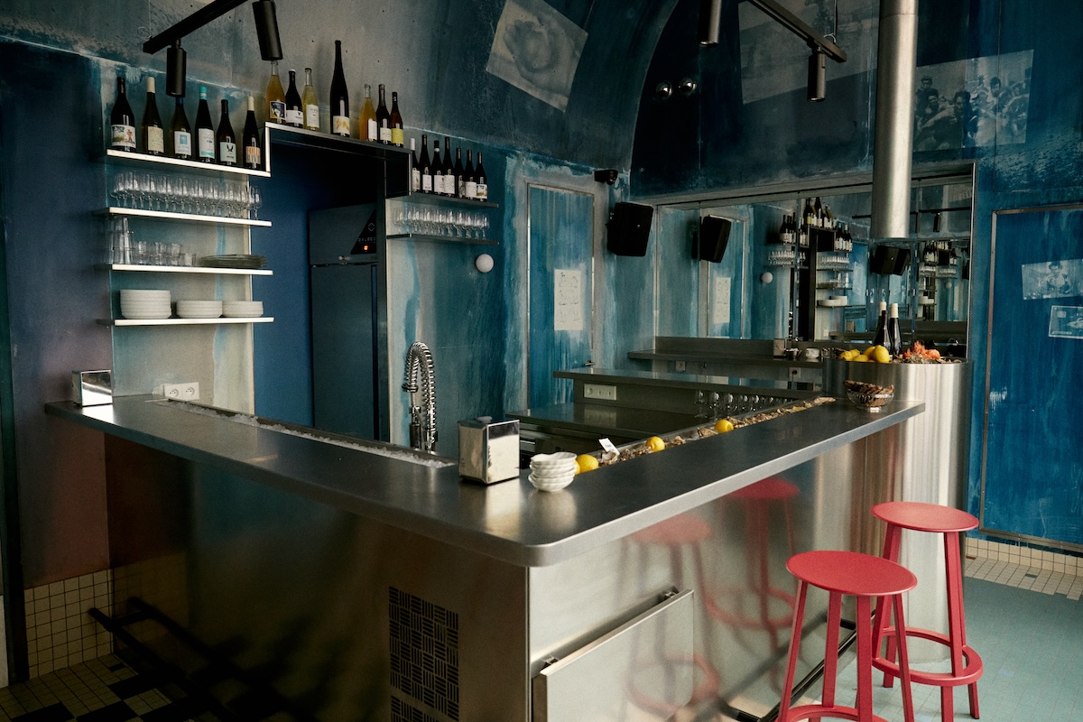 A cyanotype effect on the walls creates the feeling of being immersed in the blue of the sea and the waves. The centerpiece of the French restaurant is a stainless steel counter that is modeled on a fish stall.