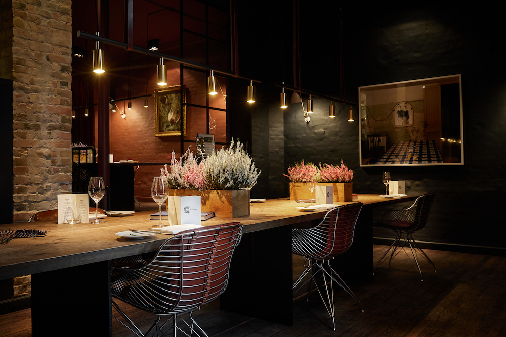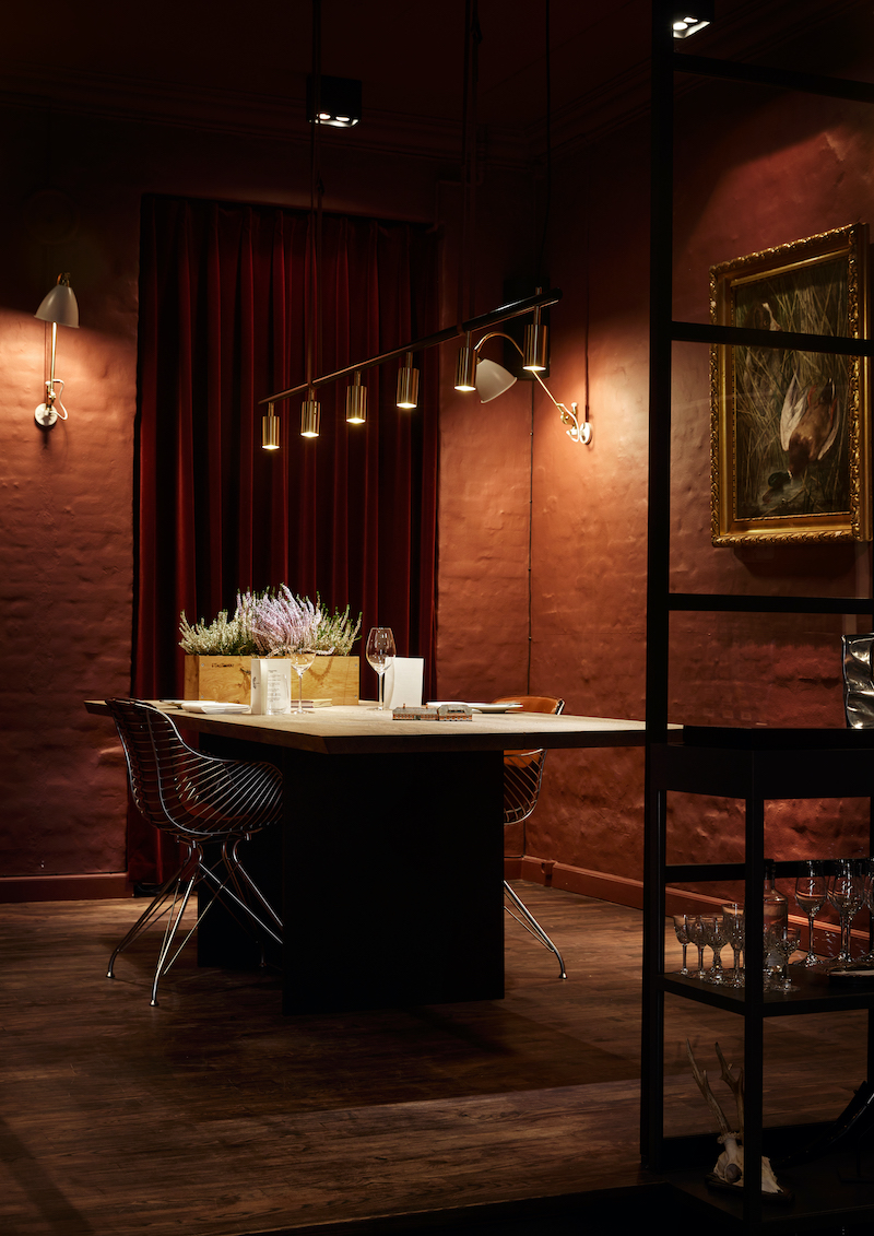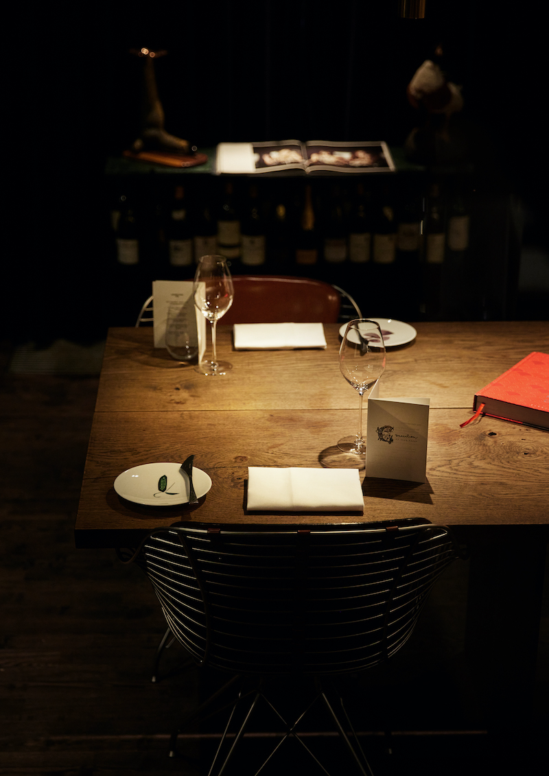 One chef, one waiter – and a maximum of 18 guests. This is the intimate setting in which British star chef Alan Bates serves his creations. Designer Bruno Jakobsen has chosen two long tables in dark-stained oak, with seating separated only by floral arrangements.