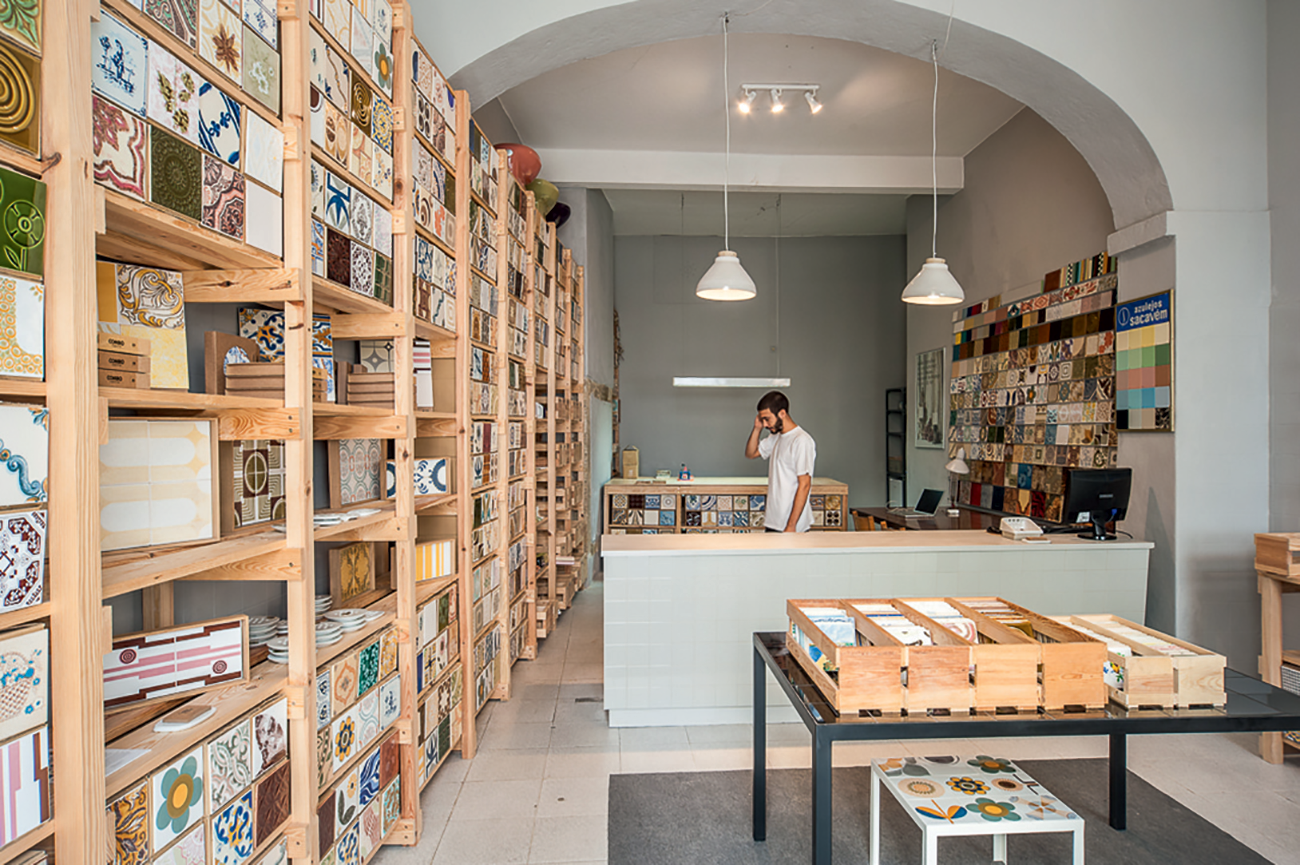 Joaquim José Cortiço can be considered a luminary of Portuguese ceramic design. In 1979 he started to purchase and sell tile collections that were no longer produced. Within three decades, he managed to collect a ceramic treasure that tile lovers can now admire. His grandsons are now continuing his work. With a limited budget they managed an efficient presentation of these special tiles via simply high wooden shelves.