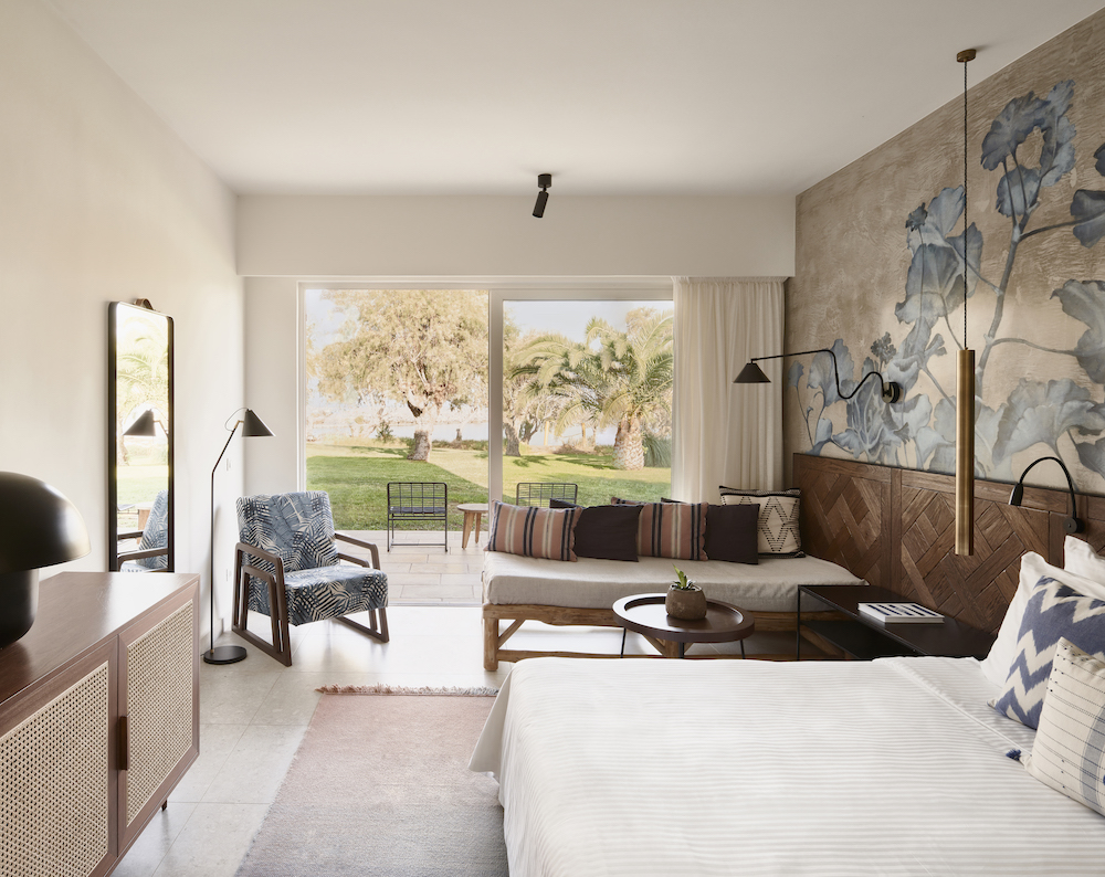 Light colors and natural materials create a warm and cozy atmosphere in the rooms. Items like Moroccan rugs, hand made Italian tiles and custom made furniture set Mediterranean accents. Further, large wall paintings feature Crete’s nature and create a connection to the resort’s gardens.