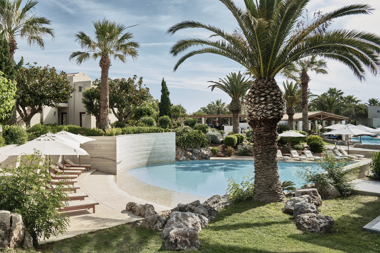 Cretan nature and contemporary design meet here. The rooms, suites and bungalows are surrounded by Mediterranean gardens with huge palm trees, cactus plants, olive and fig trees as well as native bananas. Besides the wild flora of the island, vegetables and herbs also grow here and are used in the hotel’s restaurants.