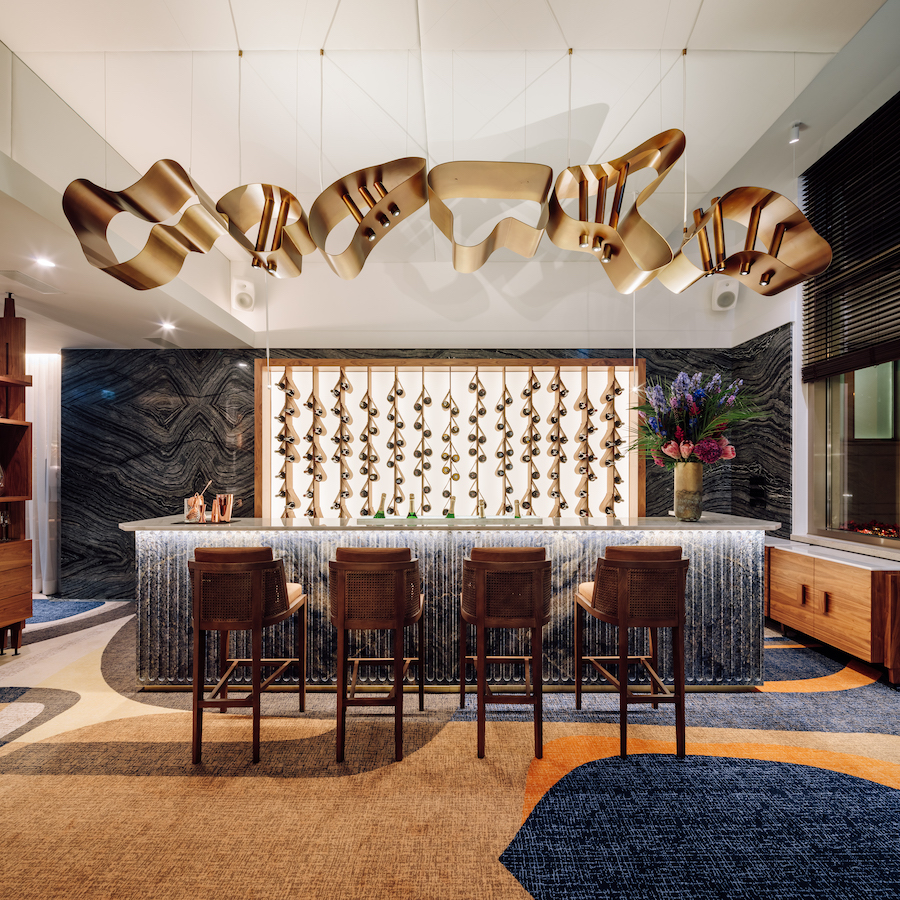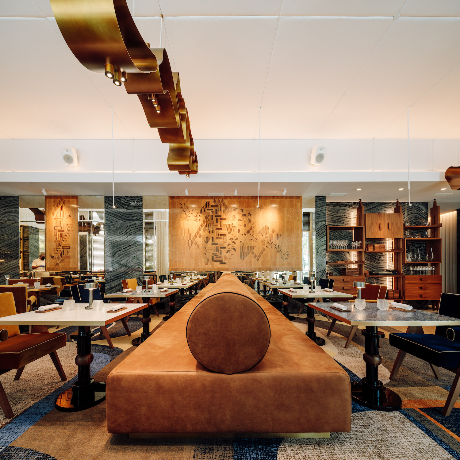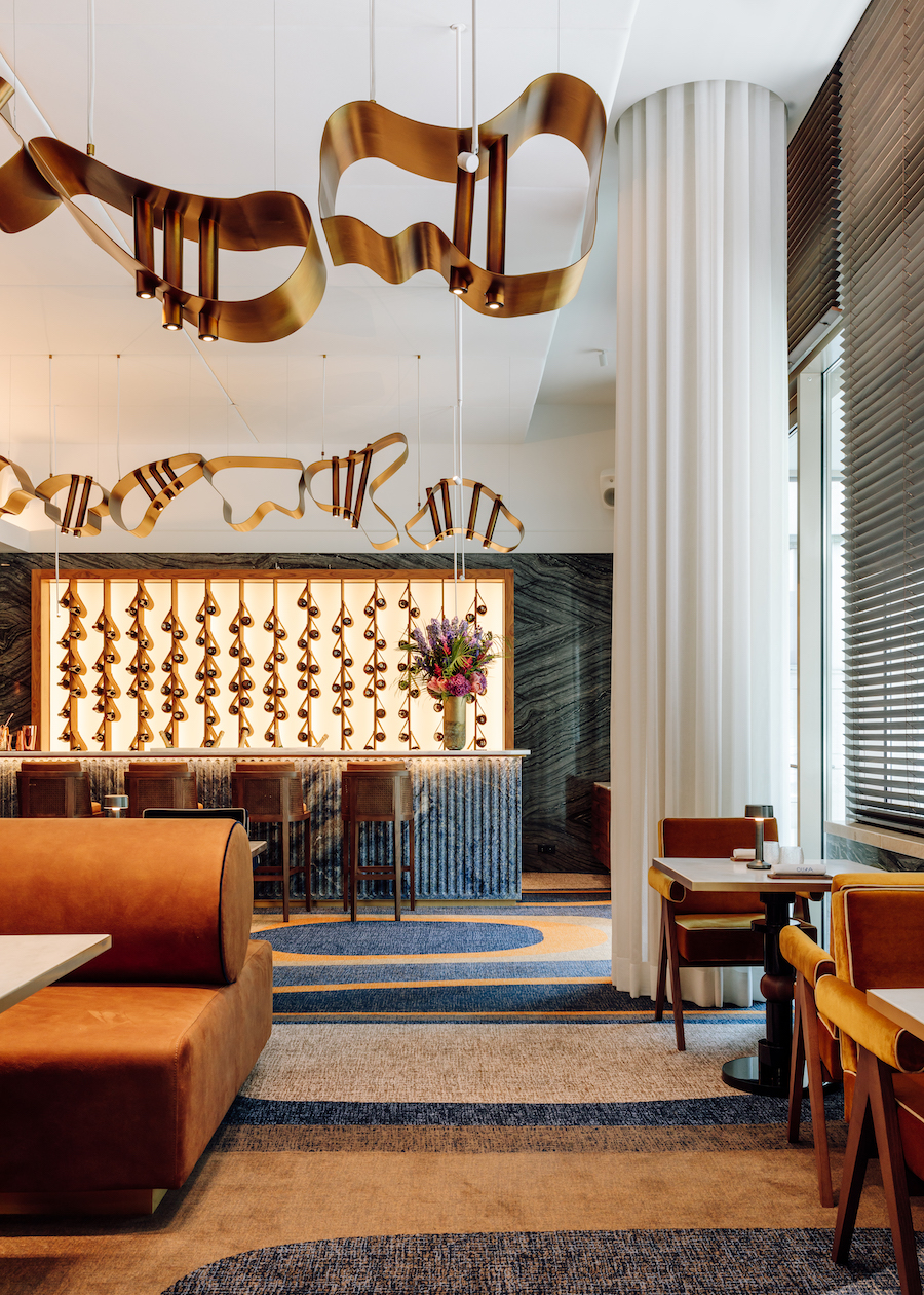 Swirling spirals of Picasso-inspired carpet, brass accents, black Kenyan marble all coexist at Cura.