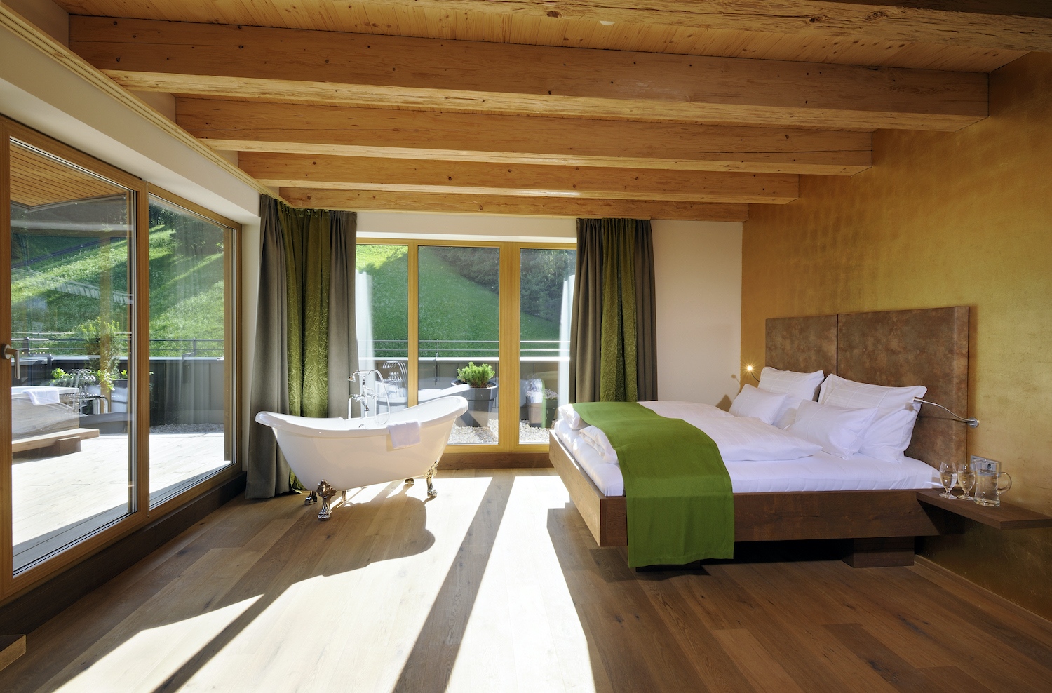 But the hotel is not only a true comfort refuge because of its natural setting in the Hohen Tauern mountains and the Gastein valley  – architecture and interior design present themselves close to nature and home country. With regional materials such as oak and Swiss stone pine wood, clay and leather as well as linen, cotton and loden a cozy and authentic atmosphere has been created. On top, custom made furniture pieces and a warm color scheme assure an alpine ambience in light flooded rooms.