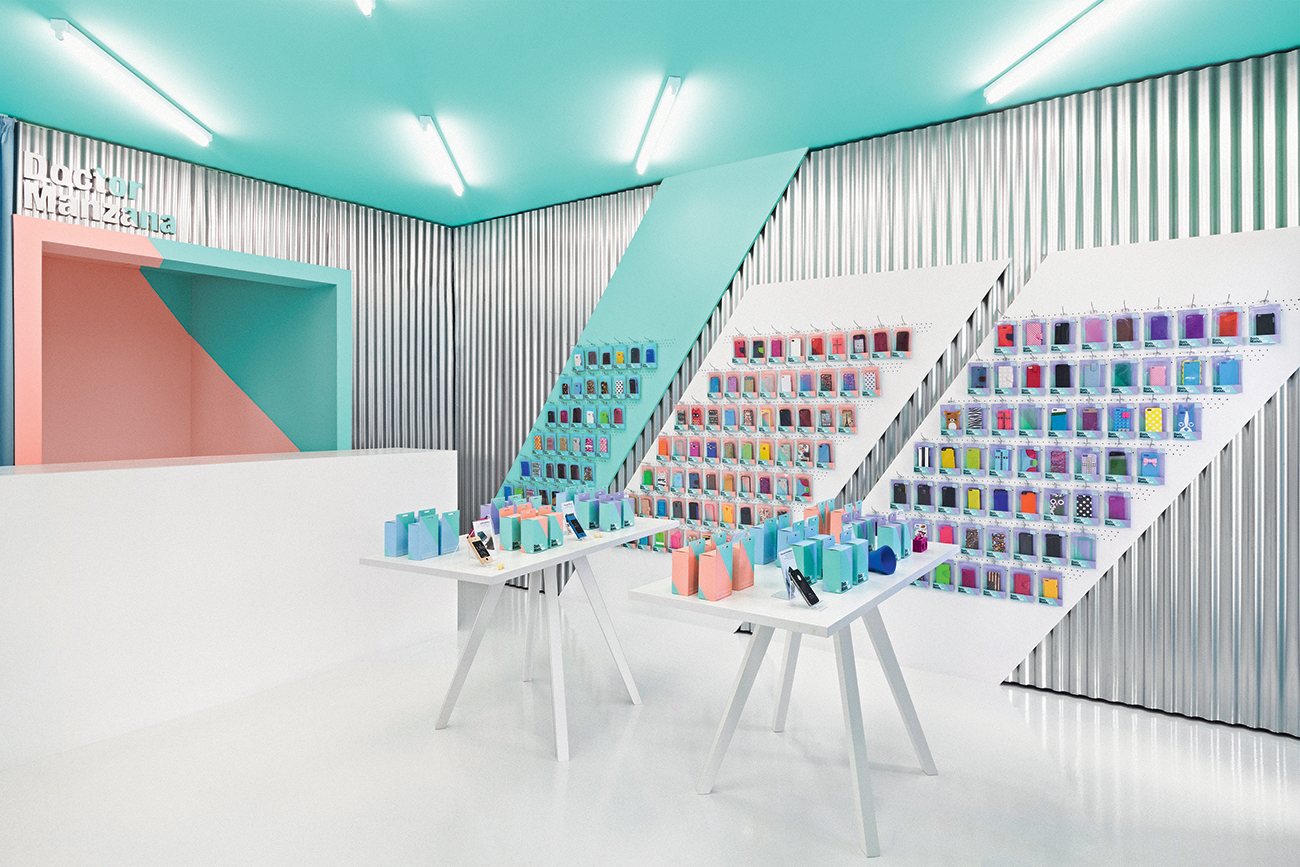 The Mobile Doctor: The brand Doctor Manzana combines technical support and gadgets. Ana Milena Hernández Palacios, creative director of Studio Masquespacio and responsible for the interior design, redesigned the entire brand and sets her focus on bold colors with a wink on the theme ‘mobile doctor’. The bluish green color scheme and surfaces made of galvanized steel do convey a clinical feel.