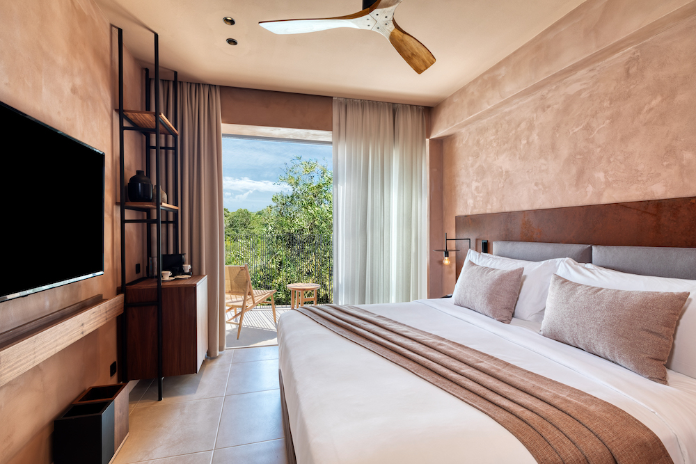 The muted earth tones of the interior are characteristic for the design, creating a harmonious connection to the surrounding nature. The use of natural materials from the region create a touch of Boho atmosphere.