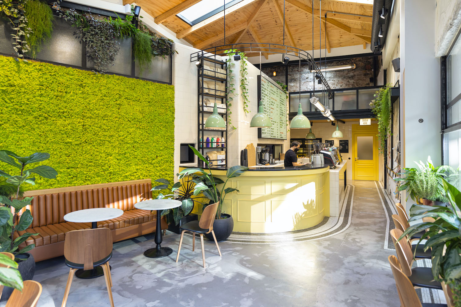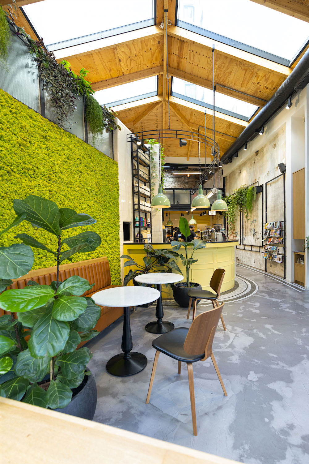 Large skylights bring lots of natural light into the store. In combination with a greened wall they let inside and outside space melt.