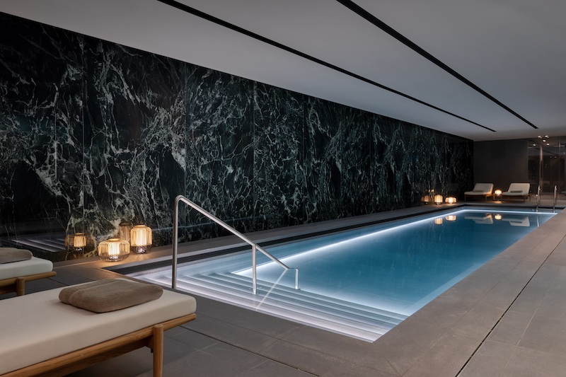 The presidential suite is the crown jewel of the hotel and has a walk-in closet, sauna and a wrap-around terrace with a whirlpool and skyline view. The 650 square meter spa offers an indoor pool, sauna, steam bath, fitness center and holistic body treatments with Babor Cosmetics.