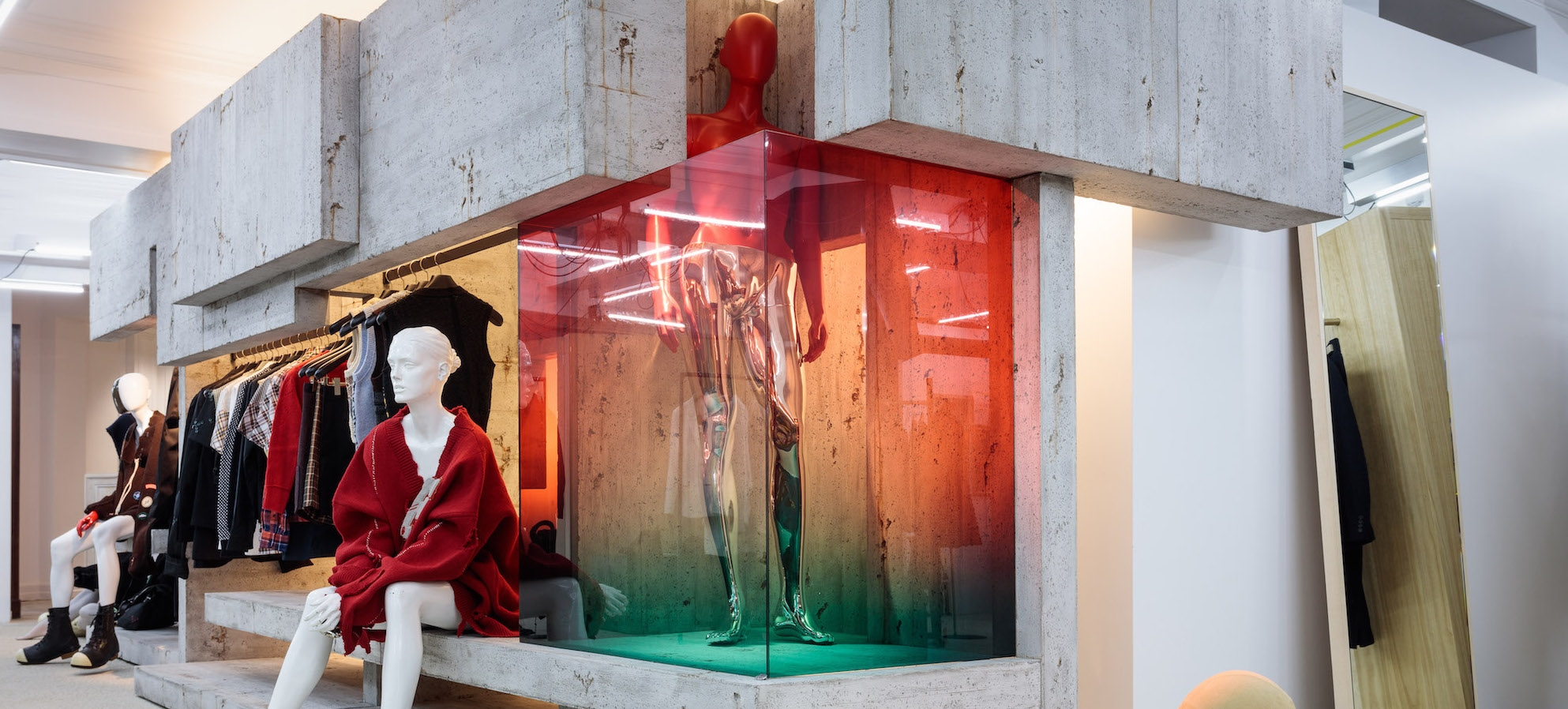 Shortly after the turn of the millennium, Bei Kawakubo of Japanese label Comme des Garçons walked through London’s Dover Street and and checked out a location for her new concept store. The street was not an established shopping area. But the shop with its seven levels was spacious and ideal for her concept. Her intention was to not only offer fashion of her own brand but also pieces of her favorite other labels. On top, the interior was to be changed twice yearly, in parallel to changing seasons. After a twelve-year long success story, the market had to leave Dover Street. With its mix of fashion, art, design, jewelry and perfumes, the concept store had become a huge attraction. Rent in the area rose immensely and the store moved to London’s Haymarket in 2016. The good news: the new store is three times larger than the old one. “I want to create a kind of market where various creators from various fields gather together and encounter each other in an ongoing atmosphere of beautiful chaos“ says Kawakubo about her store. The DSM vibe now spreads across five levels and almost 3,000 square meters and features labels such as Rick Owens, Vetements or Gosha Rubchinskiy and their approach to presentation. For the opening, Rem Koolhaas’ OMA- and AMO-Teams designed the exhibition of jewelry label Repossi.
