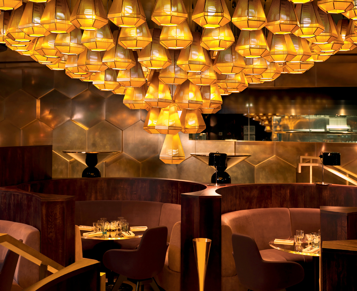 Eclectic is Tom Dixon’s first interior design project in Paris: a contemporary brasserie in Beaugrenelle, a newly adapted 70s shopping center in the 15th Arrondissement. Inspired by its surroundings, design elements is reminiscent of Brutalism. Pure geometry, like hexagons as a reoccuring theme along a copper wall or Dixon’s sculptural light design. This is spearheaded by a central chandelier called ‘Cell Light’ constructed of 124 metal lamp shades.