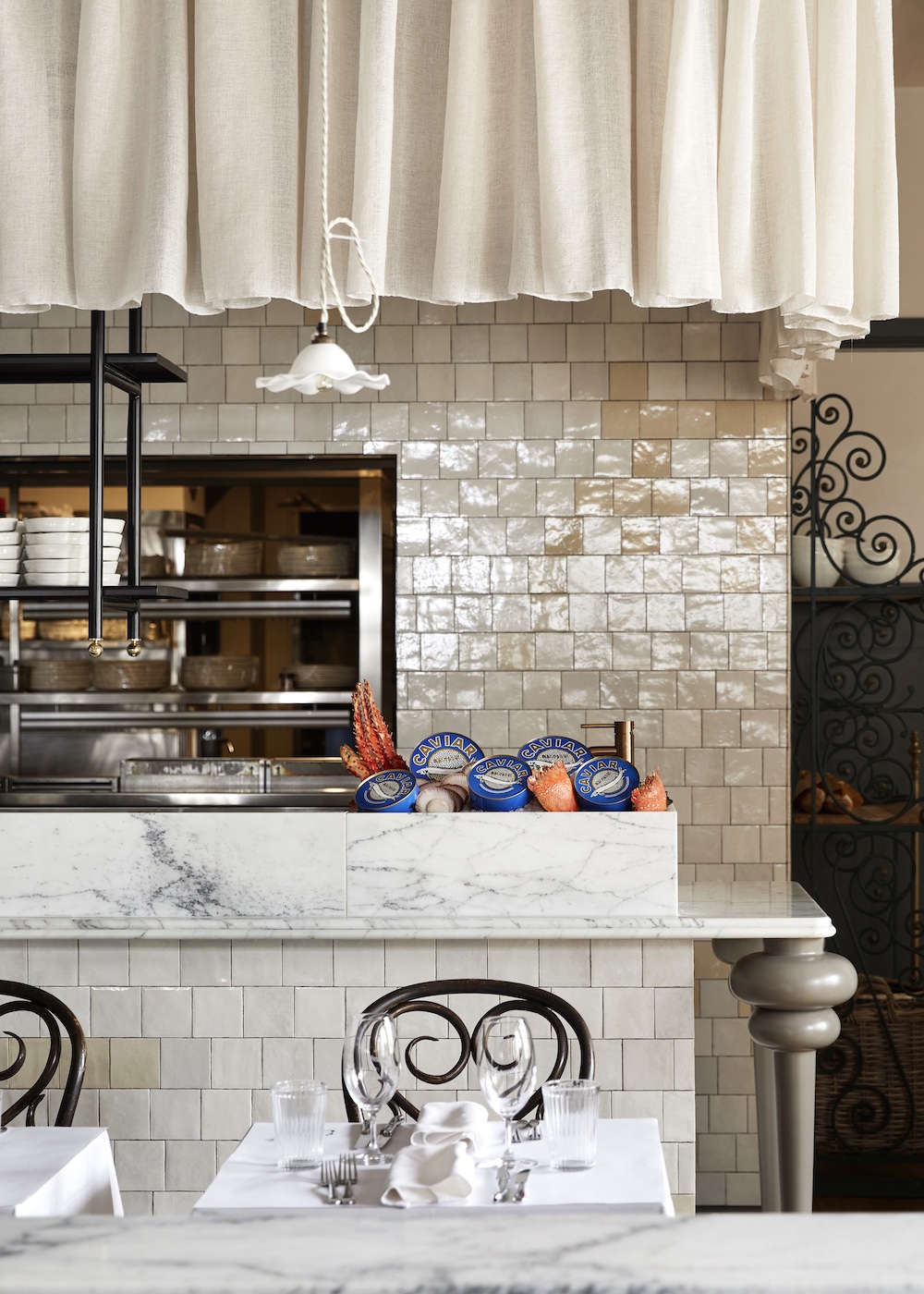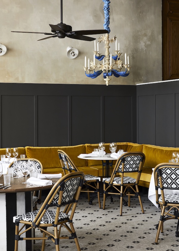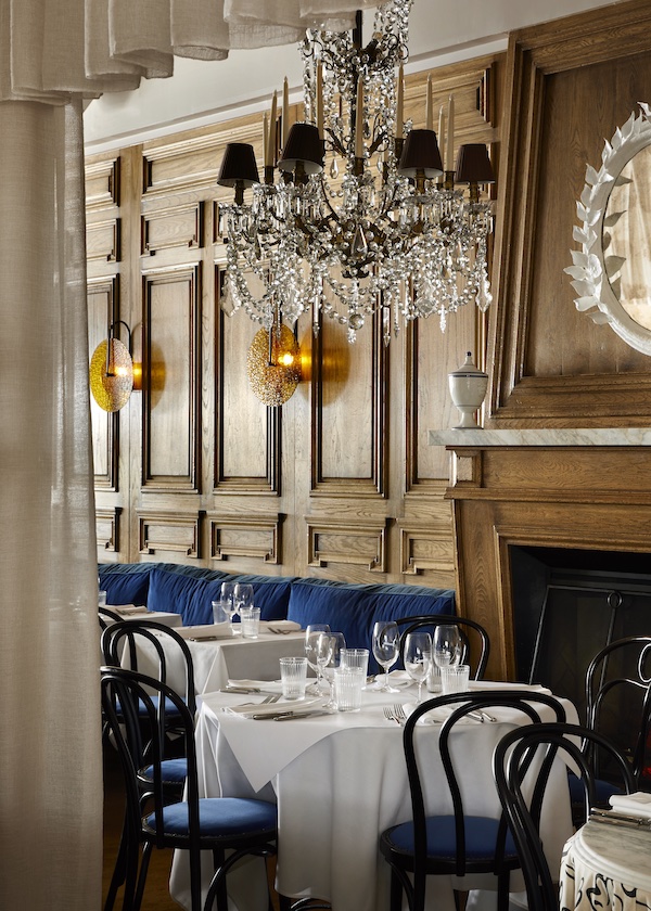 In other words, the restaurant beguiles with a sense of grace, joy and conviviality. The charismatic wooden store front with its typical wicker bistro chairs is reminiscent of a nostalgic Parisian café. Inside, patterned mosaic floors, antique French oak paneling from a Parisian chateau, sumptuous velvet banquettes and spirited accents in deep gold, periwinkle and royal blue create a warm and captivating dining atmosphere.