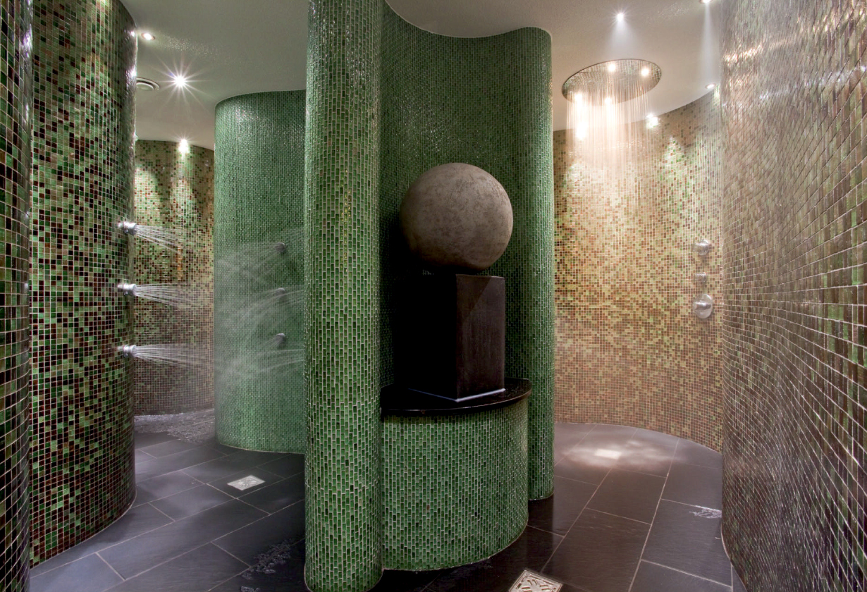 The ESPA Riga ist part of a 19th century Art Nouveau building in the heart of Riga built by famous Latvian architect Konstantīns Pēkšēns. The material and color mix is striking: natural stone, leather, metal, glass, mirrors, nutwood are combined with vibrant colors such as violet and orance. These are complimented with tiles that play with the shimmer of famous Baltic amber.