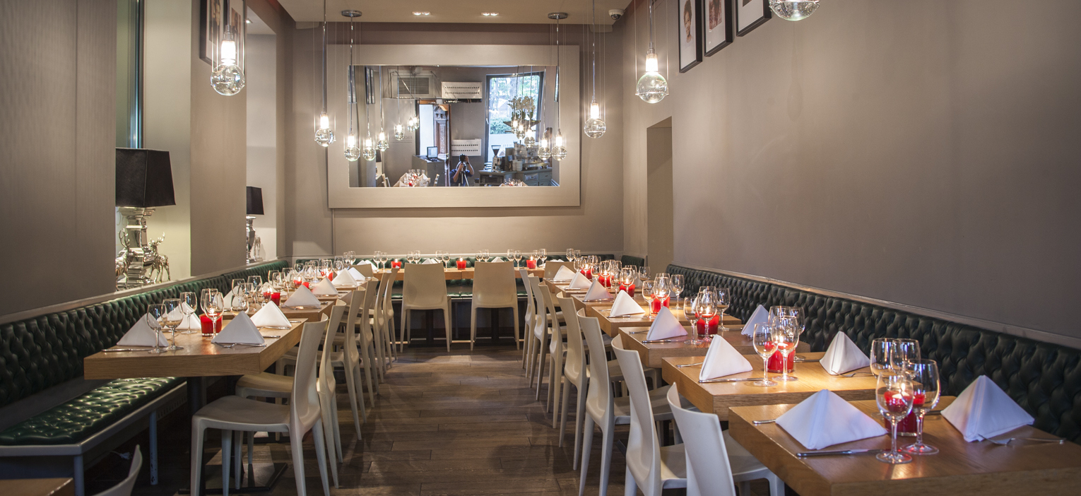 “Our interior is pure and simple and without any frills“ says owner Robert Zimmermann about his restaurant. This statement is overmodest. The green leather benches with Chesterfield quilting, the white chairs and the colossal mirror have been attracting Cologne’s in-crowd into the restaurant of the Apropos concept store for years.