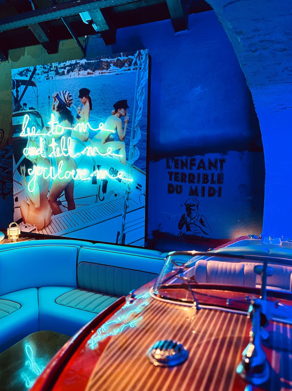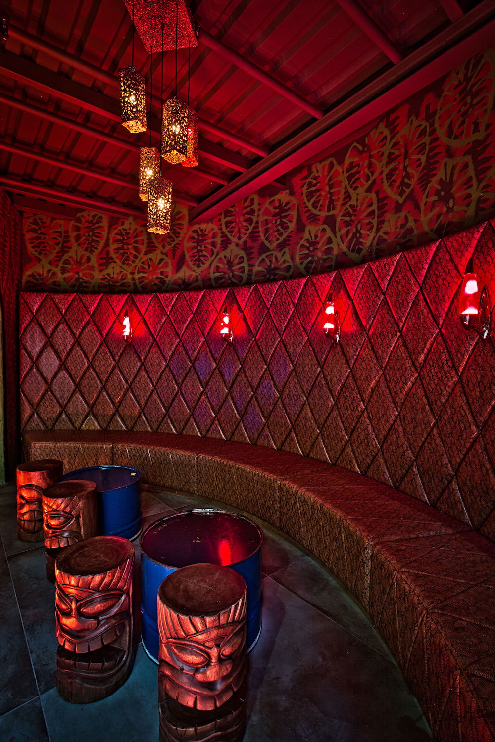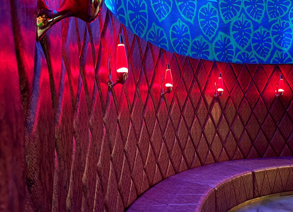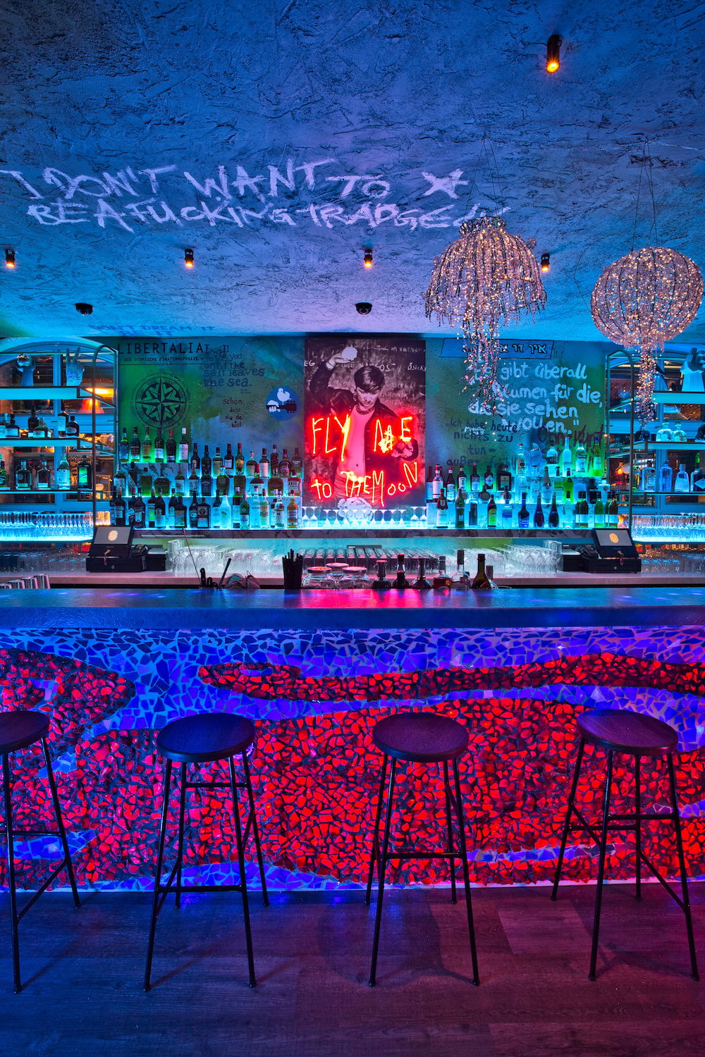 For that, he transformed the power house built in 1908 on the Union area in Frankfurt’s Ostend, that hosted the legendary King Kamehameha Club until 2013, into an urban place of yearning, The historic building is now filled with art, graphic design and numerous playful details. Interior highlights are the lit Oktopus Bar put together by thousands of blue glass mosaic tiles and the Riva Lounge that resembles a 50s elegant Italian boat.