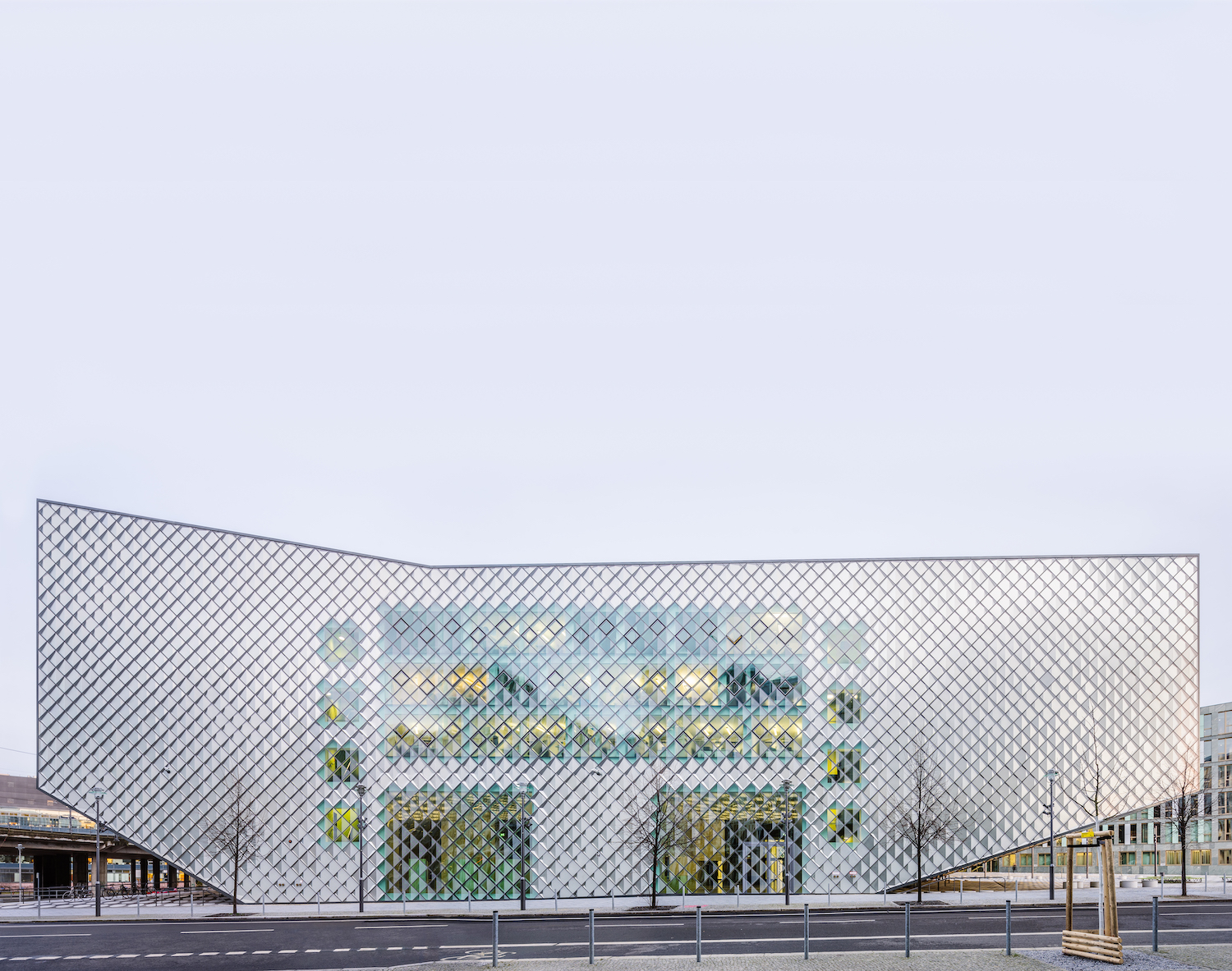 In Berlin’s government district, directly across from the Spreebogen, the Futurium – House for the Future is located and planned to be used for events and exhibits. With its slightly asymmetrical building complex, the concept designed by local architects Richter Musikowski mirrors its name. The striking facade consists of several thousand  octothorpely aligned pan elements with metal reflectors and ceramic printed glass. An architectural masterpiece was achieved with two 28 meters wide panoramic windows. Its static was achieved with the help of steel and concrete elements. The exhibition area inside covers about 3,200 square meters that are divided by a permanent collection and a smaller area of 600 square meters for special exhibits.